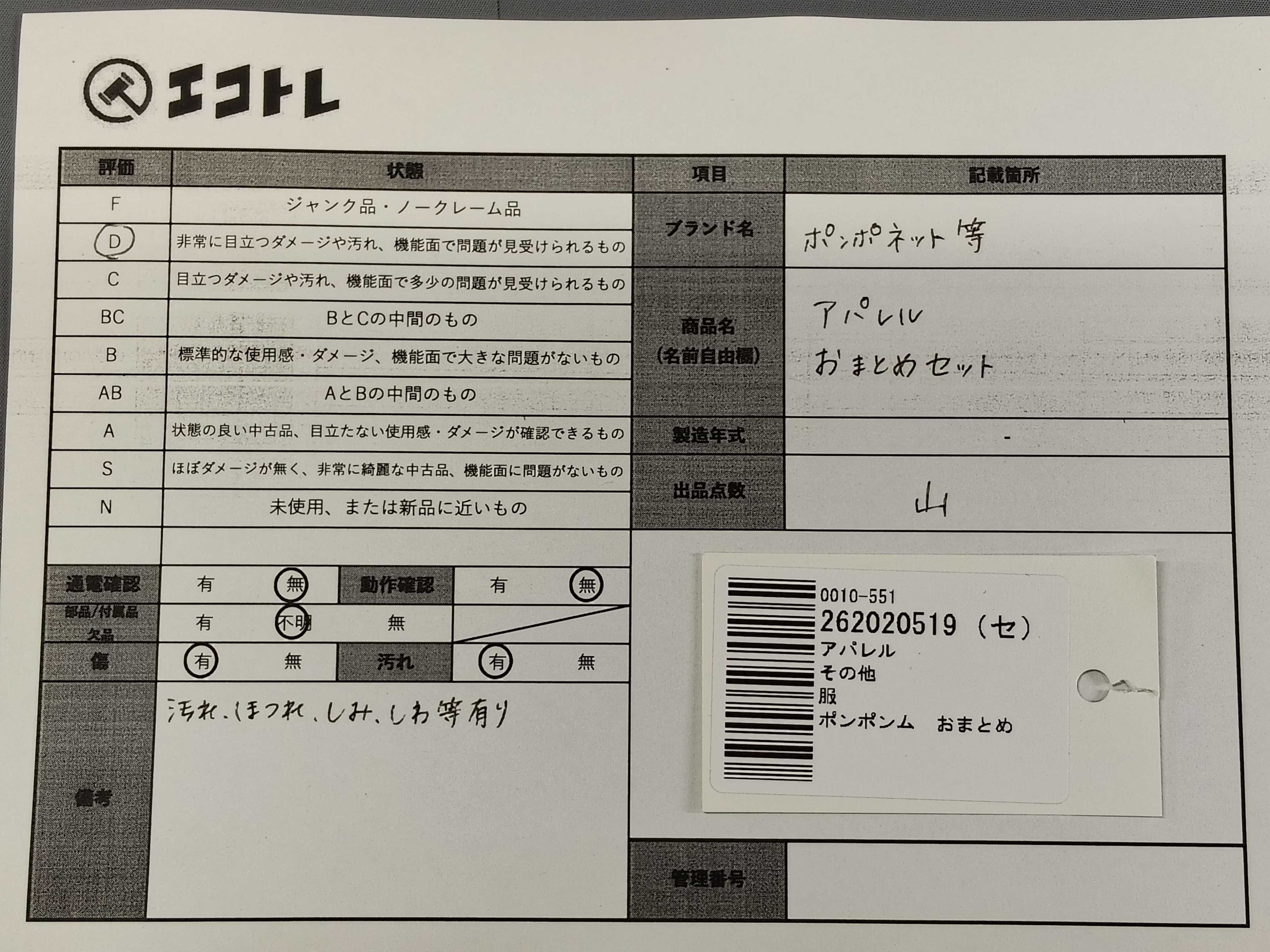 商品内容によって、JITBOXなどでの発送となる可能性がございます事ご理解下さい。年式などの商品情報詳細は写真にてご確認願います。※ご入札の際はご利用規約をよくお読みになってからのご参加お願いします。","タイプライン": "", "カテゴリ": "アパレル", "形状コード": "トップス", "付属品コード": "", "シリアル・シール・型番": ""