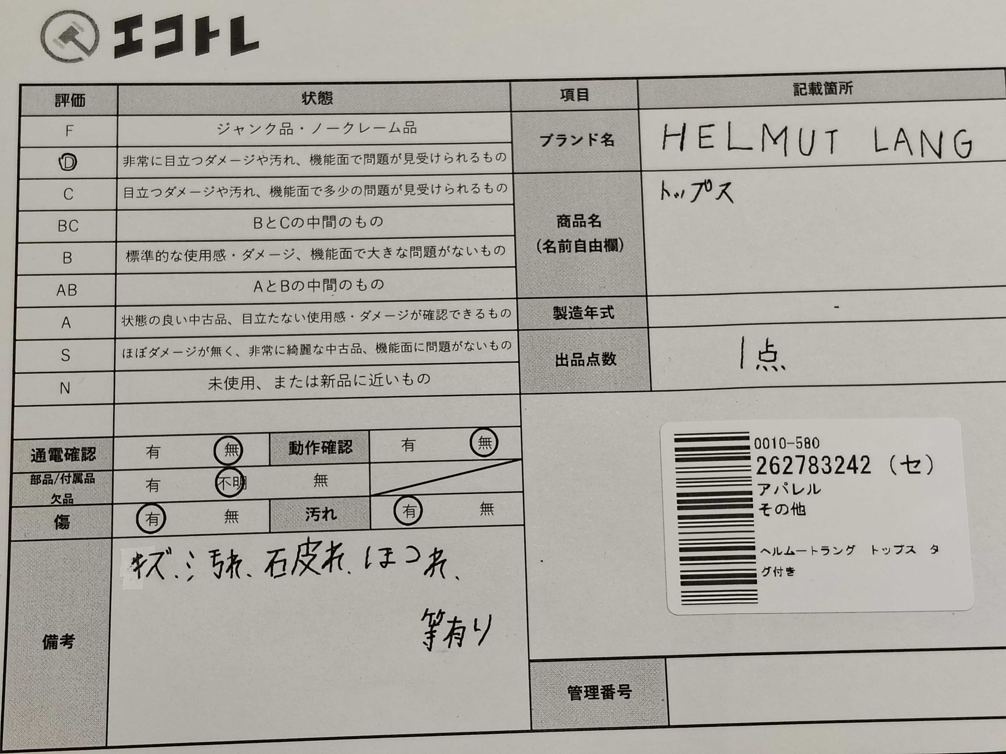 商品内容によって、JITBOXなどでの発送となる可能性がございます事ご理解下さい。年式などの商品情報詳細は写真にてご確認願います。※ご入札の際はご利用規約をよくお読みになってからのご参加お願いします。","タイプライン": "", "カテゴリ": "アパレル", "形状コード": "トップス", "付属品コード": "", "シリアル・シール・型番": ""
