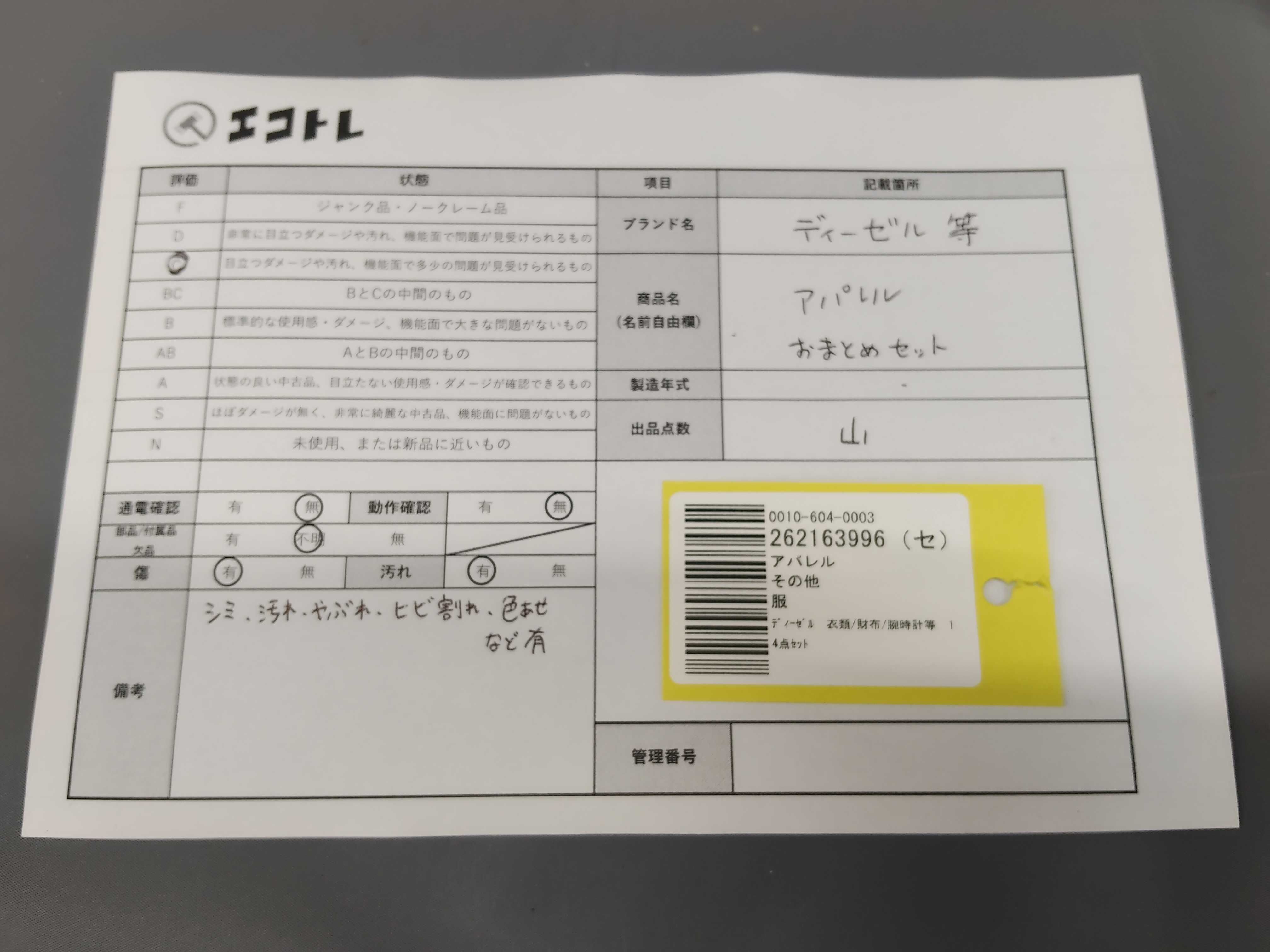 商品内容によって、JITBOXなどでの発送となる可能性がございます事ご理解下さい。年式などの商品情報詳細は写真にてご確認願います。※ご入札の際はご利用規約をよくお読みになってからのご参加お願いします。","タイプライン": "", "カテゴリ": "アパレル", "形状コード": "その他アパレル", "付属品コード": "", "シリアル・シール・型番": ""