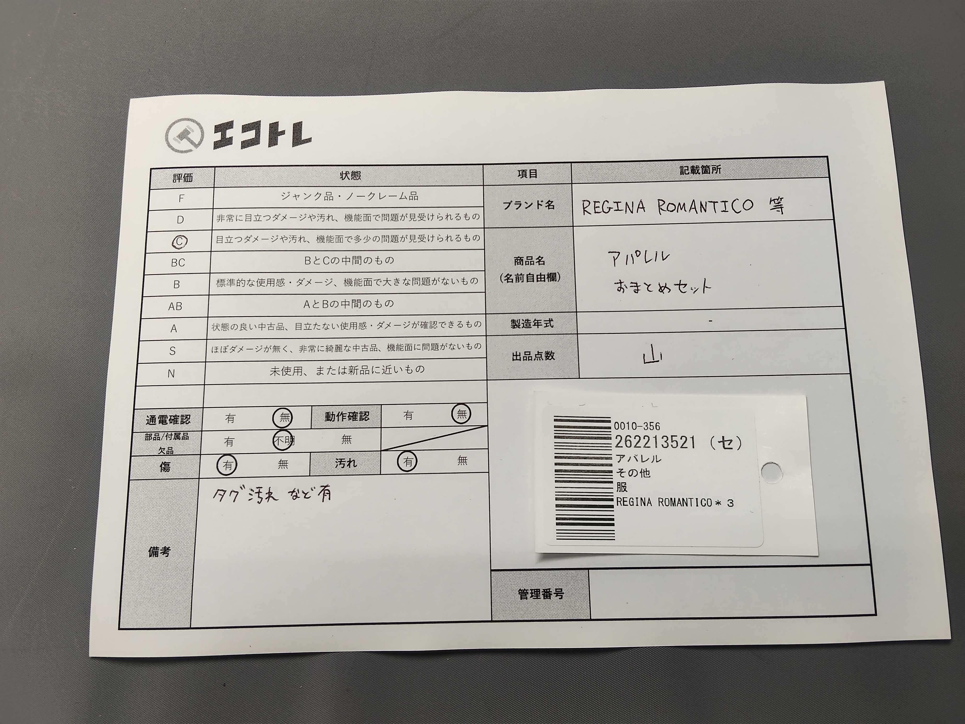 タグ汚れ、など有","タイプライン": "", "カテゴリ": "アパレル", "形状コード": "その他アパレル", "付属品コード": "", "シリアル・シール・型番": ""