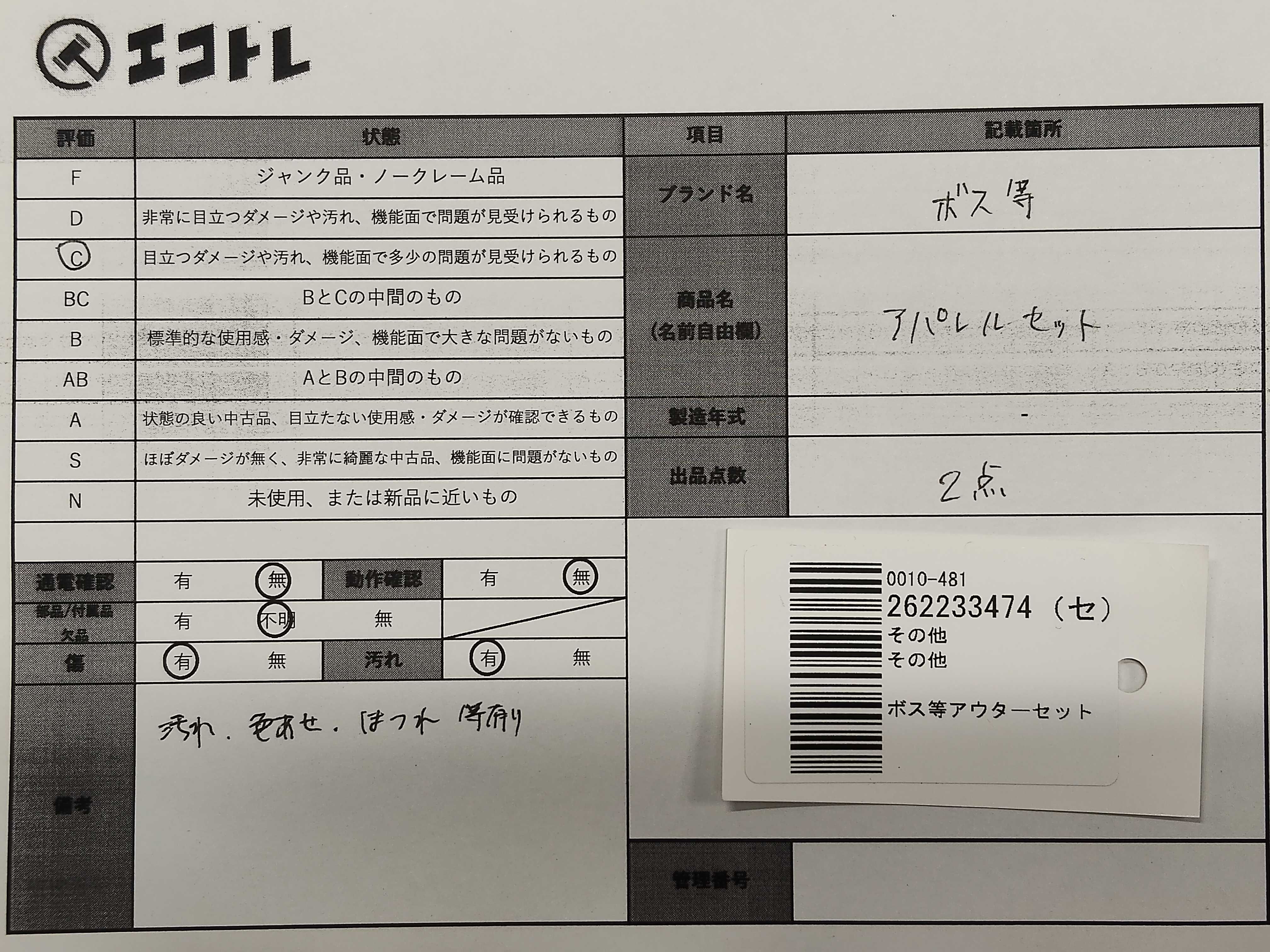 商品内容によって、JITBOXなどでの発送となる可能性がございます事ご理解下さい。年式などの商品情報詳細は写真にてご確認願います。※ご入札の際はご利用規約をよくお読みになってからのご参加お願いします。","タイプライン": "", "カテゴリ": "アパレル", "形状コード": "その他アパレル", "付属品コード": "", "シリアル・シール・型番": ""