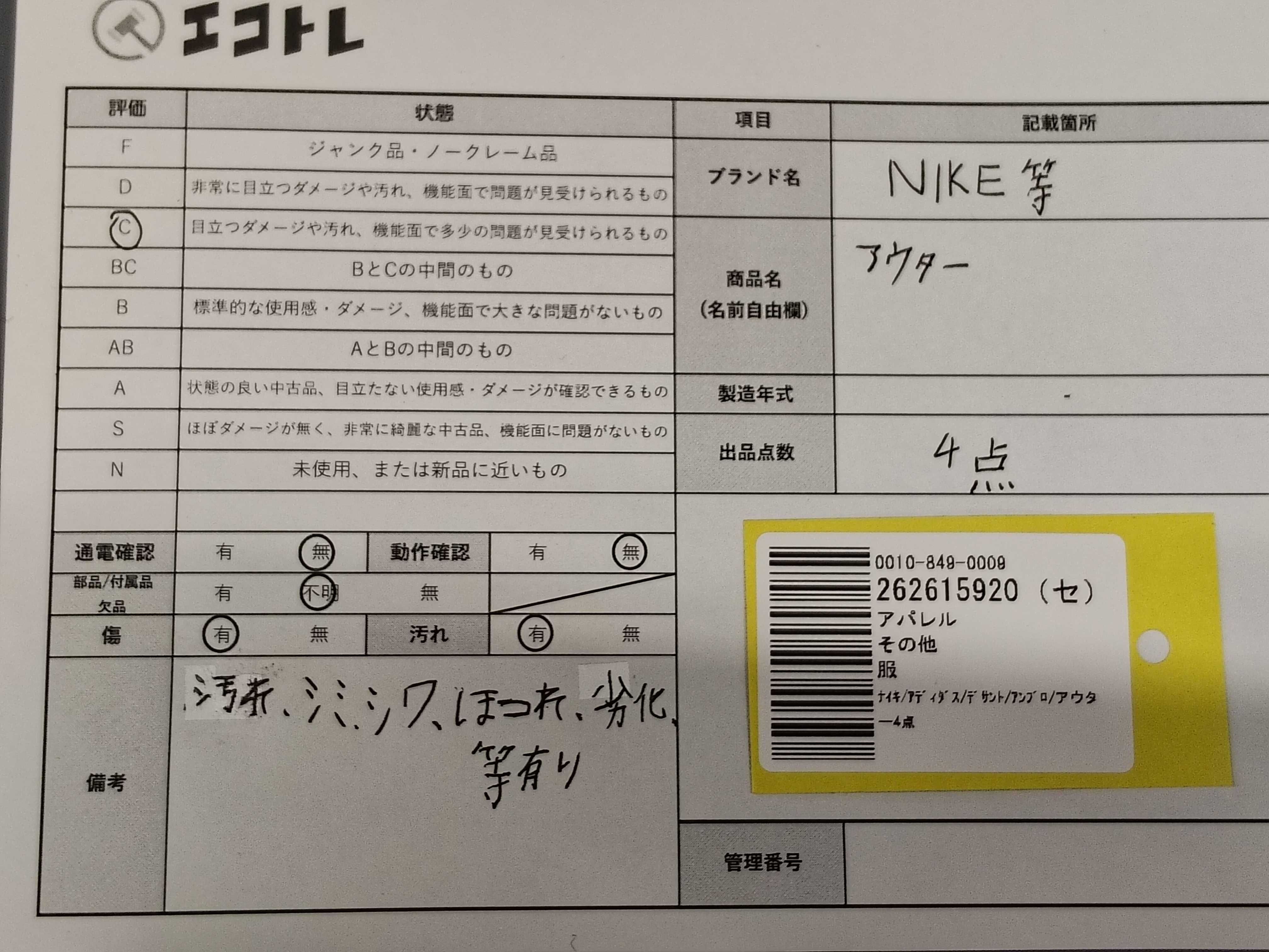 商品内容によって、JITBOXなどでの発送となる可能性がございます事ご理解下さい。年式などの商品情報詳細は写真にてご確認願います。※ご入札の際はご利用規約をよくお読みになってからのご参加お願いします。","タイプライン": "", "カテゴリ": "アパレル", "形状コード": "その他アパレル", "付属品コード": "", "シリアル・シール・型番": ""