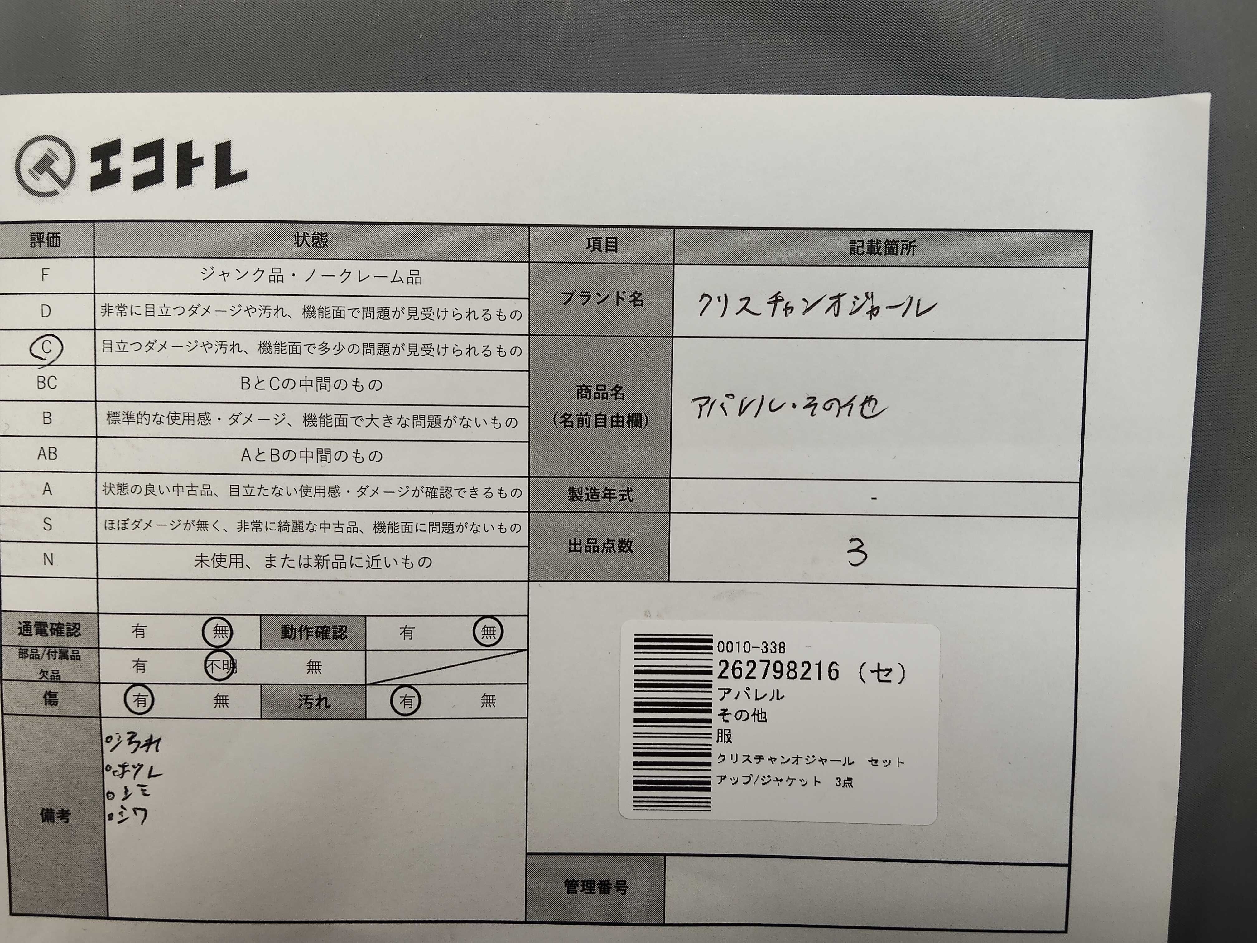 商品内容によって、JITBOXなどでの発送となる可能性がございます事ご理解下さい。年式などの商品情報詳細は写真にてご確認願います。※ご入札の際はご利用規約をよくお読みになってからのご参加お願いします。","タイプライン": "", "カテゴリ": "アパレル", "形状コード": "その他アパレル", "付属品コード": "", "シリアル・シール・型番": ""