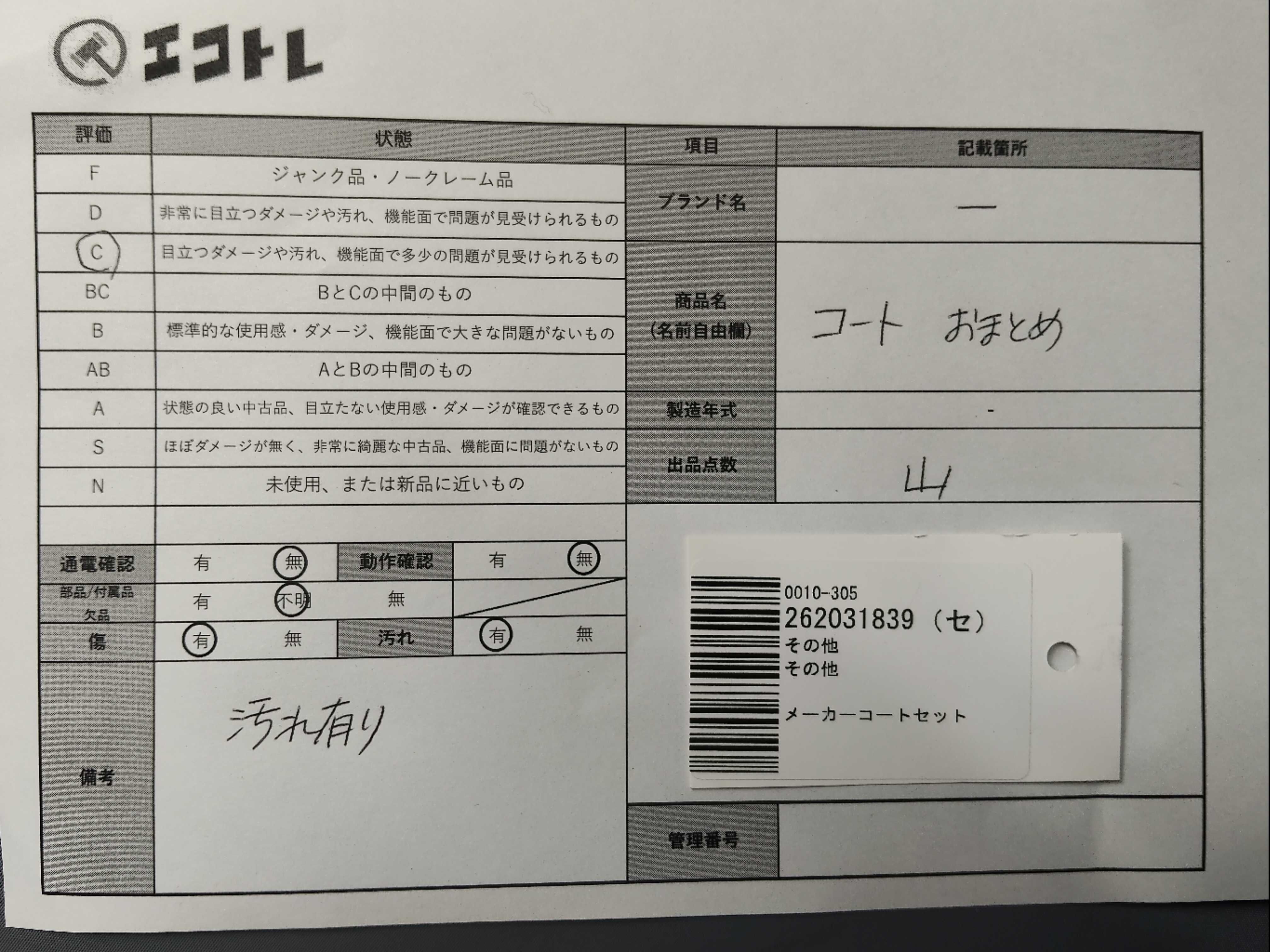 商品内容によって、JITBOXなどでの発送となる可能性がございます事ご理解下さい。年式などの商品情報詳細は写真にてご確認願います。※ご入札の際はご利用規約をよくお読みになってからのご参加お願いします。","タイプライン": "", "カテゴリ": "アパレル", "形状コード": "コート", "付属品コード": "", "シリアル・シール・型番": ""
