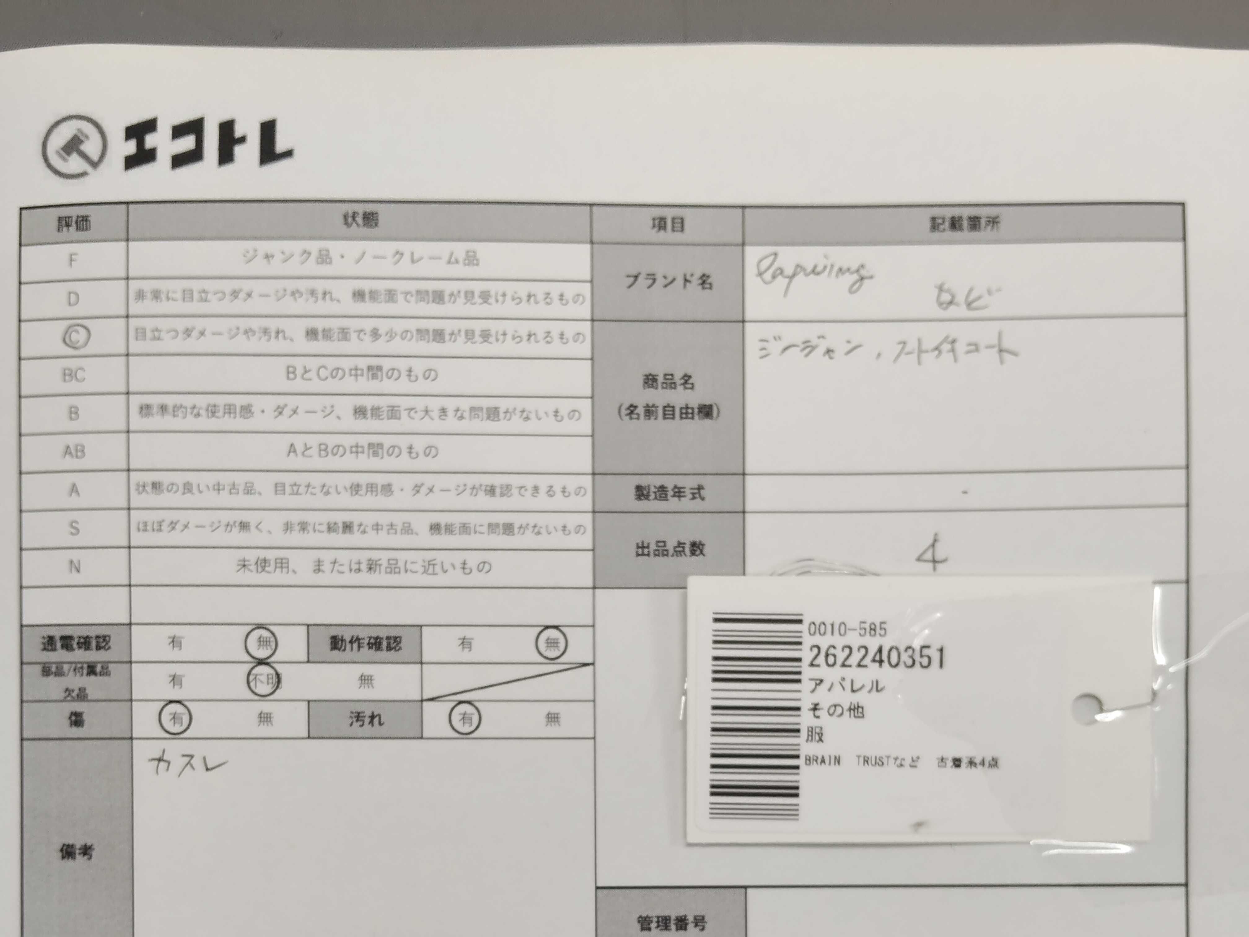 商品内容によって、JITBOXなどでの発送となる可能性がございます事ご理解下さい。年式などの商品情報詳細は写真にてご確認願います。※ご入札の際はご利用規約をよくお読みになってからのご参加お願いします。","タイプライン": "", "カテゴリ": "アパレル", "形状コード": "コート", "付属品コード": "", "シリアル・シール・型番": ""