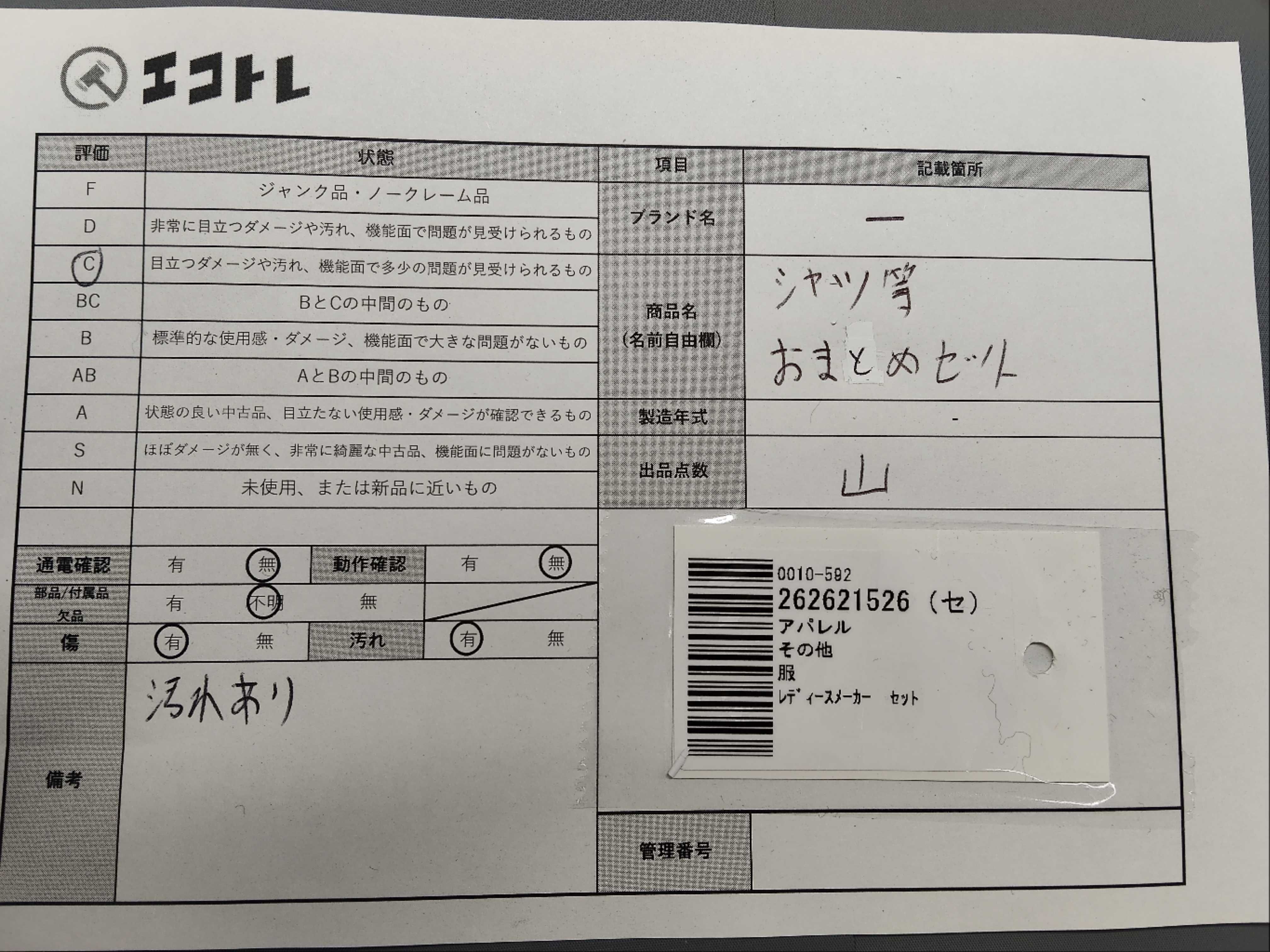 商品内容によって、JITBOXなどでの発送となる可能性がございます事ご理解下さい。年式などの商品情報詳細は写真にてご確認願います。※ご入札の際はご利用規約をよくお読みになってからのご参加お願いします。","タイプライン": "", "カテゴリ": "アパレル", "形状コード": "シャツ", "付属品コード": "", "シリアル・シール・型番": ""