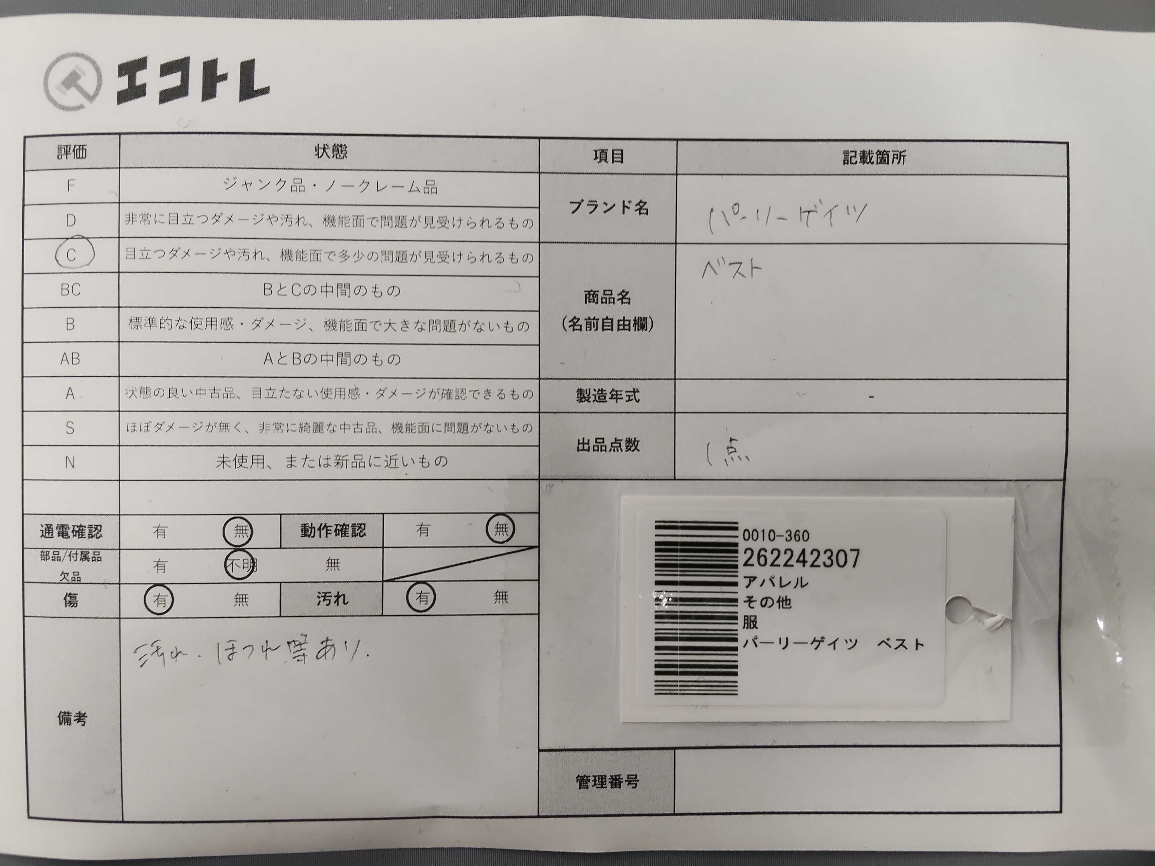 商品内容によって、JITBOXなどでの発送となる可能性がございます事ご理解下さい。年式などの商品情報詳細は写真にてご確認願います。※ご入札の際はご利用規約をよくお読みになってからのご参加お願いします。","タイプライン": "", "カテゴリ": "アパレル", "形状コード": "ベスト", "付属品コード": "", "シリアル・シール・型番": ""