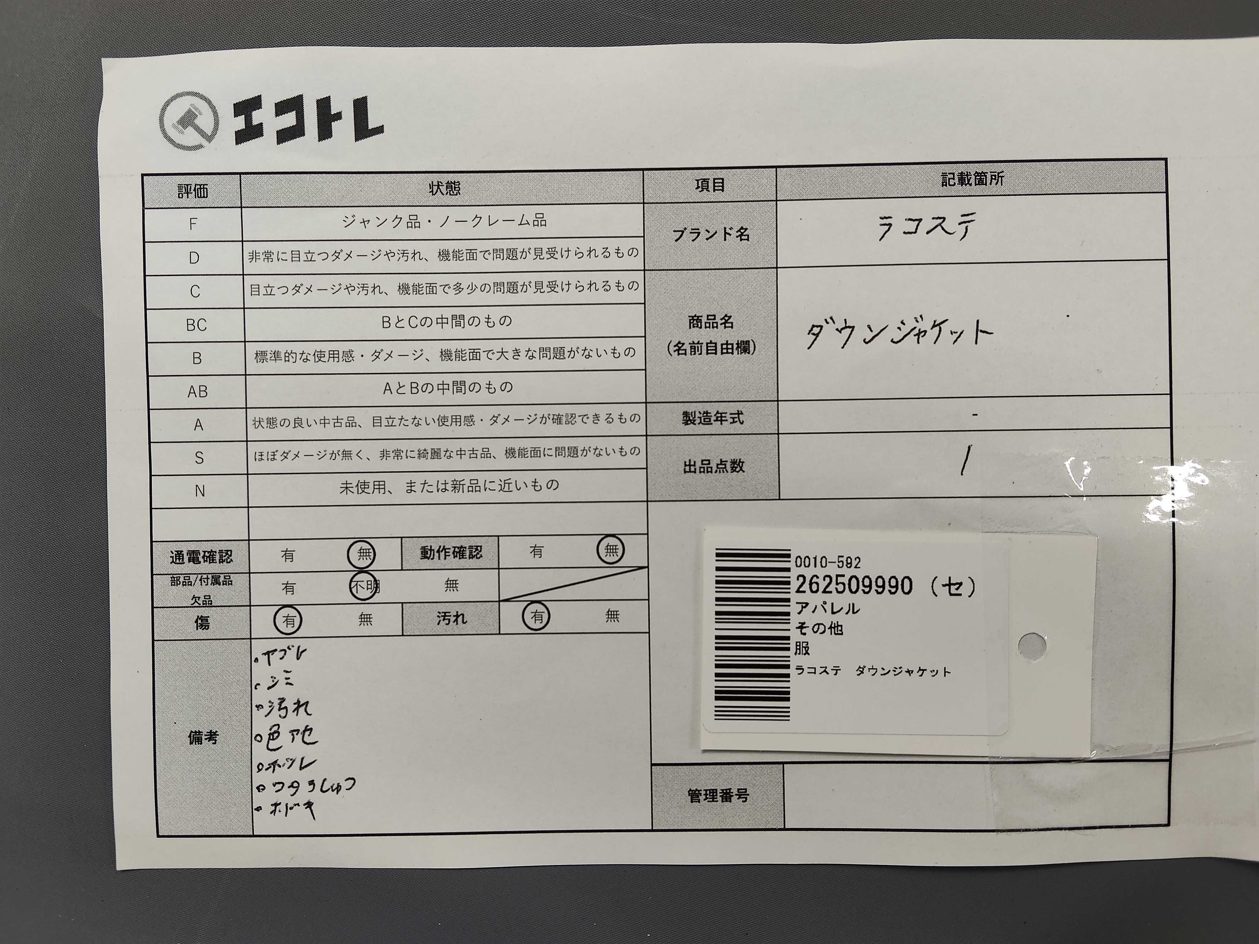 商品内容によって、JITBOXなどでの発送となる可能性がございます事ご理解下さい。年式などの商品情報詳細は写真にてご確認願います。※ご入札の際はご利用規約をよくお読みになってからのご参加お願いします。","タイプライン": "", "カテゴリ": "アパレル", "形状コード": "ジャケット", "付属品コード": "", "シリアル・シール・型番": ""
