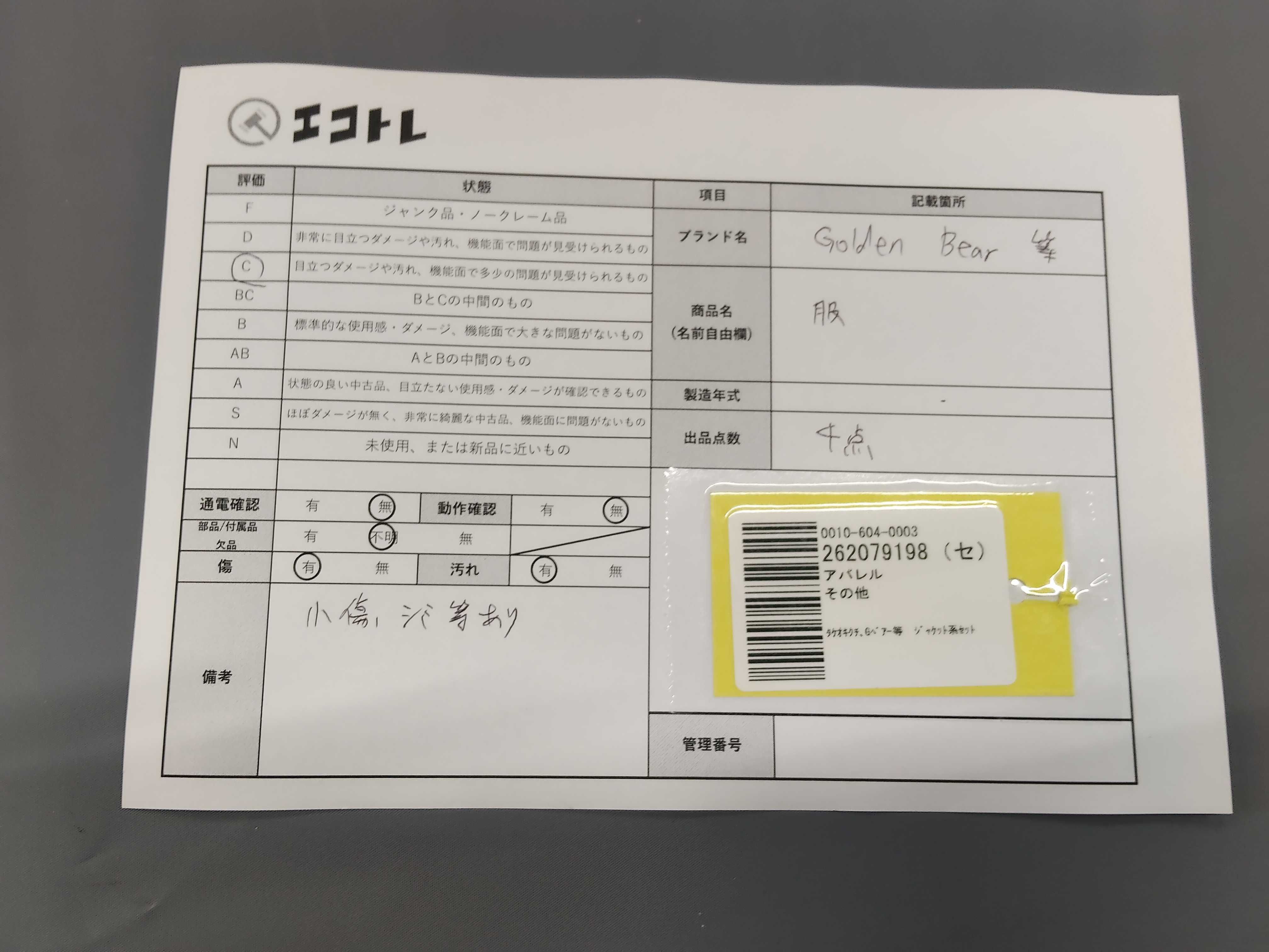 商品内容によって、JITBOXなどでの発送となる可能性がございます事ご理解下さい。年式などの商品情報詳細は写真にてご確認願います。※ご入札の際はご利用規約をよくお読みになってからのご参加お願いします。","タイプライン": "", "カテゴリ": "アパレル", "形状コード": "ジャケット", "付属品コード": "", "シリアル・シール・型番": ""