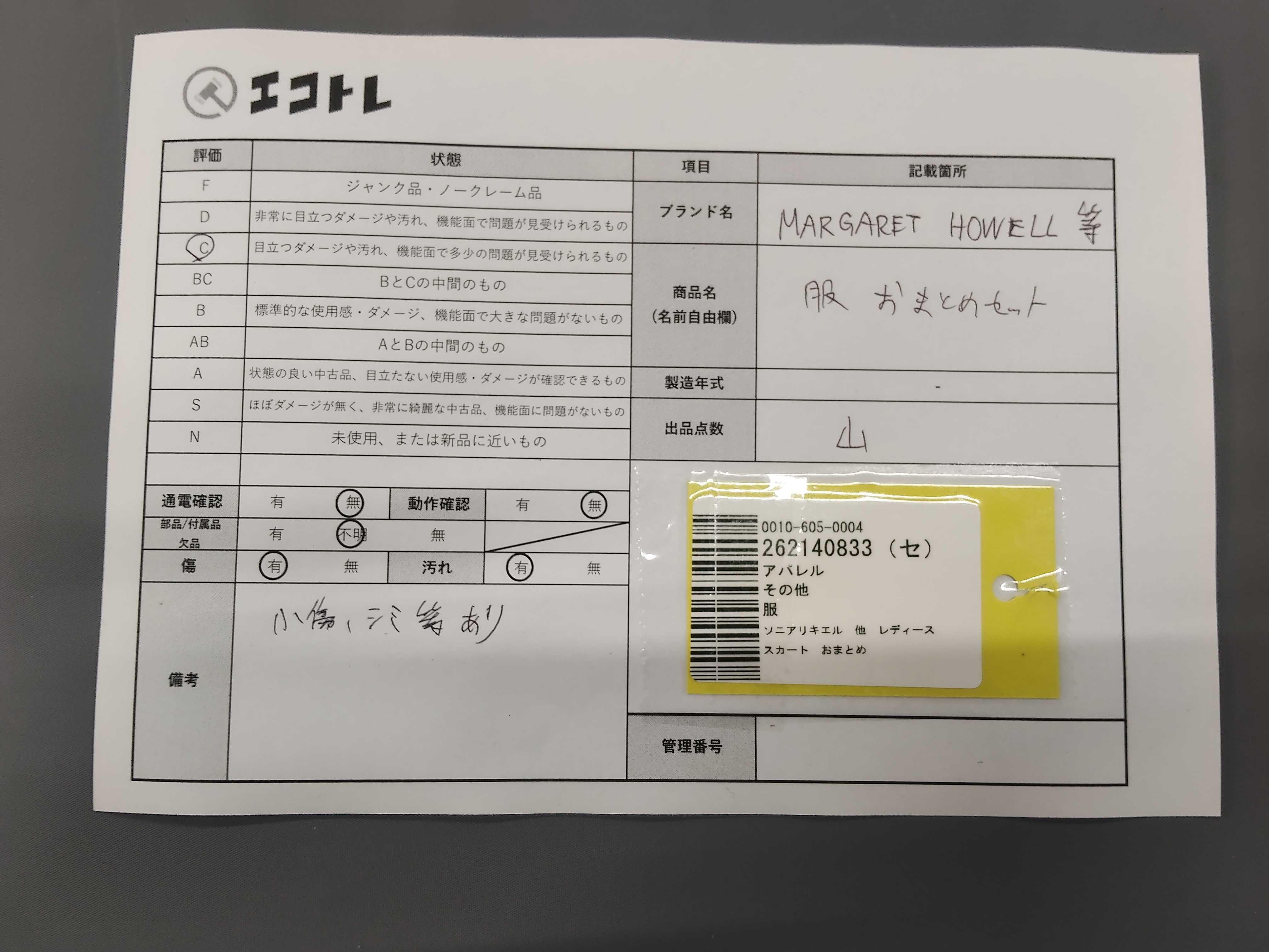 商品内容によって、JITBOXなどでの発送となる可能性がございます事ご理解下さい。年式などの商品情報詳細は写真にてご確認願います。※ご入札の際はご利用規約をよくお読みになってからのご参加お願いします。","タイプライン": "", "カテゴリ": "アパレル", "形状コード": "スカート", "付属品コード": "", "シリアル・シール・型番": ""