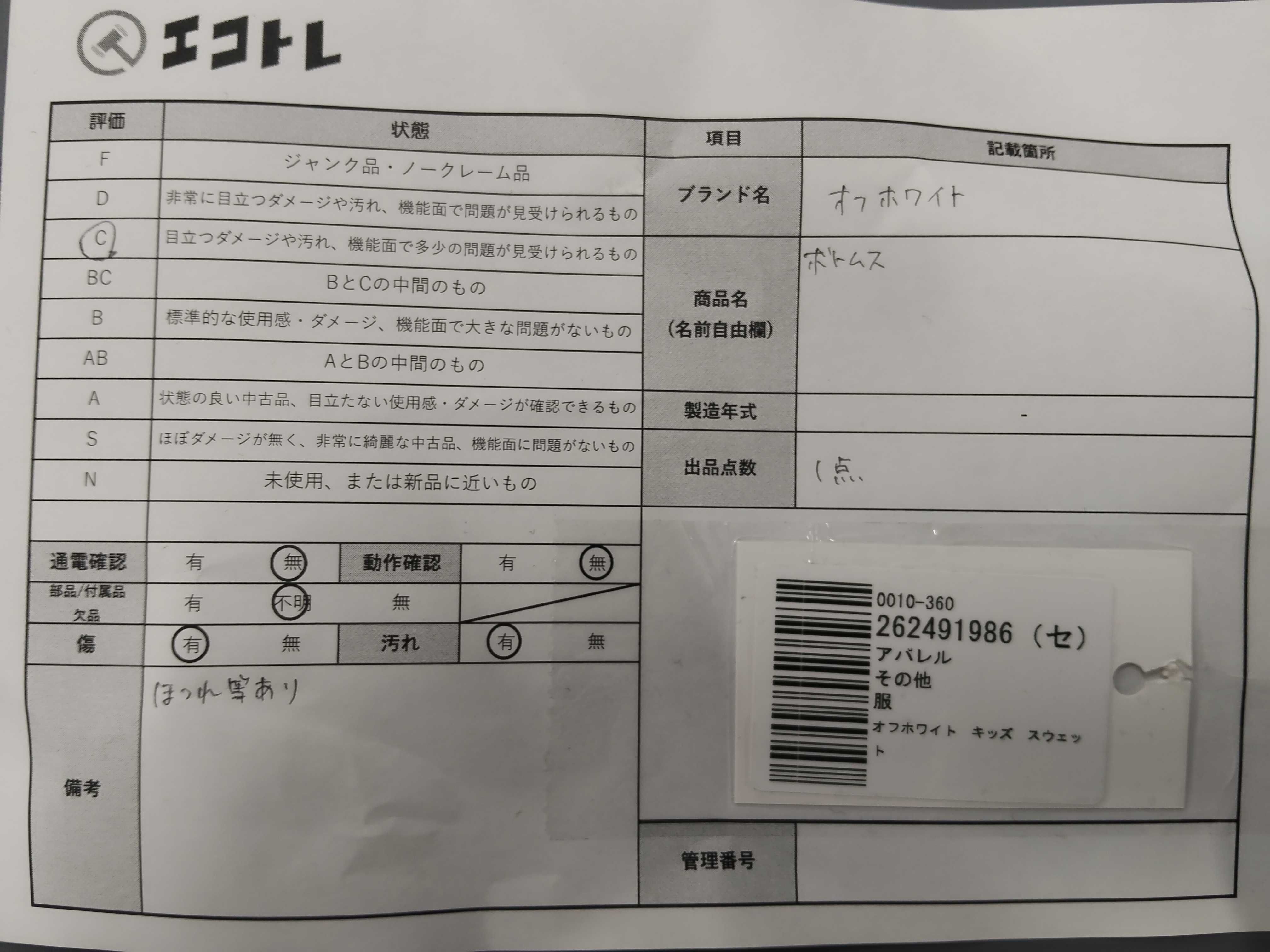 (11946_0363)▼オフホワイト キッズ スウェット パンツ