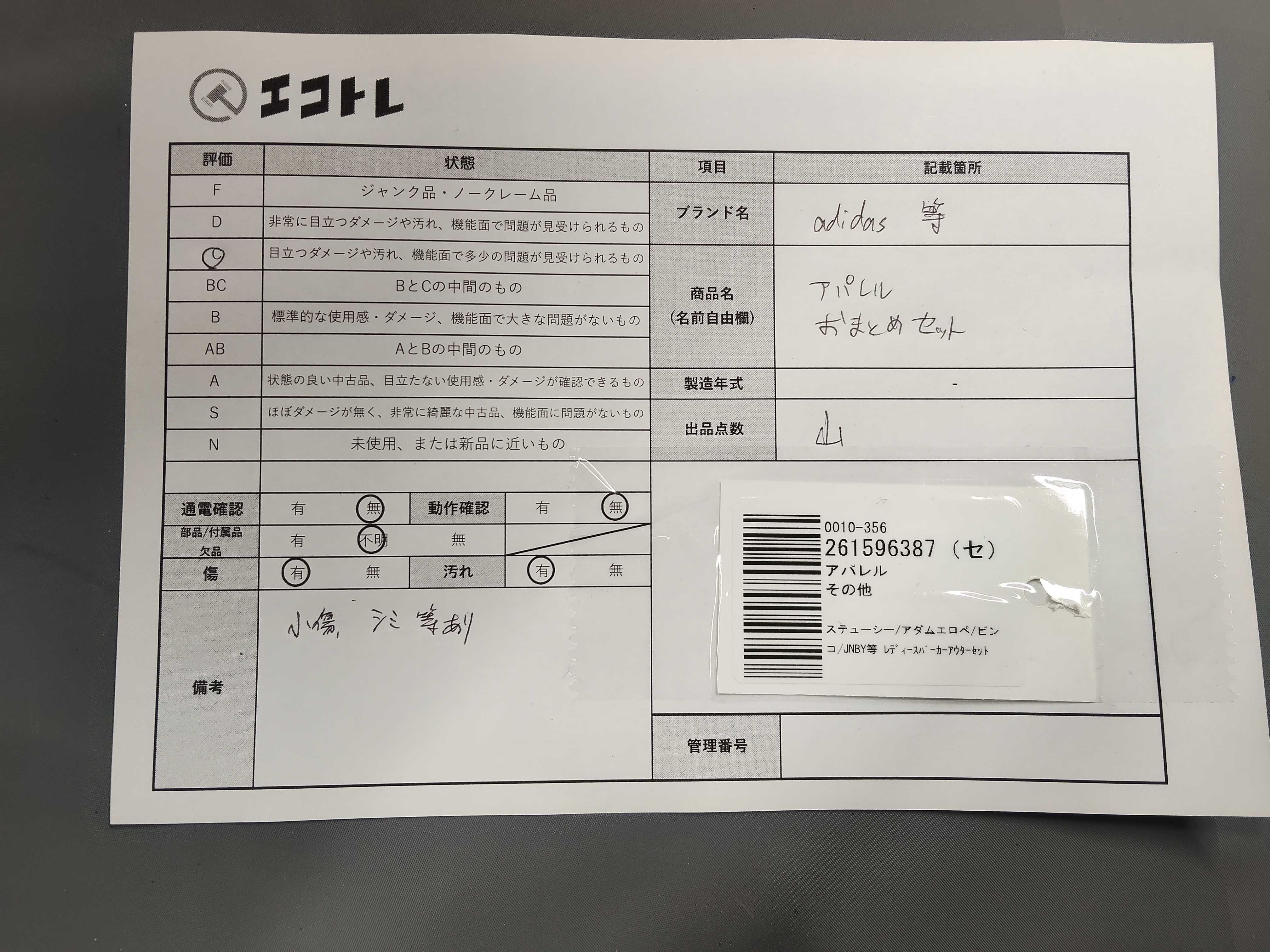 商品内容によって、JITBOXなどでの発送となる可能性がございます事ご理解下さい。年式などの商品情報詳細は写真にてご確認願います。※ご入札の際はご利用規約をよくお読みになってからのご参加お願いします。","タイプライン": "", "カテゴリ": "アパレル", "形状コード": "トップス", "付属品コード": "", "シリアル・シール・型番": ""