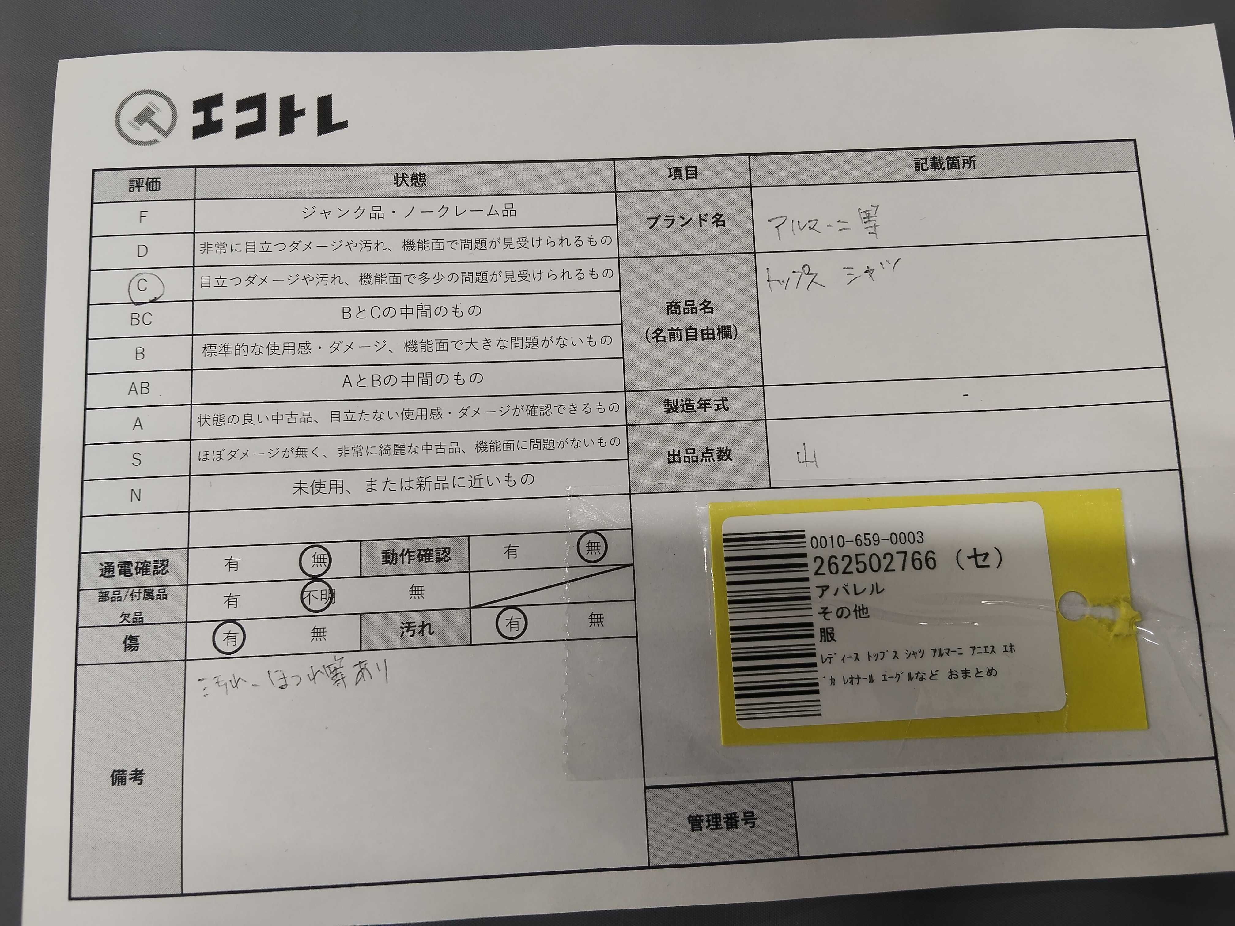 商品内容によって、JITBOXなどでの発送となる可能性がございます事ご理解下さい。年式などの商品情報詳細は写真にてご確認願います。※ご入札の際はご利用規約をよくお読みになってからのご参加お願いします。","タイプライン": "", "カテゴリ": "アパレル", "形状コード": "トップス", "付属品コード": "", "シリアル・シール・型番": ""