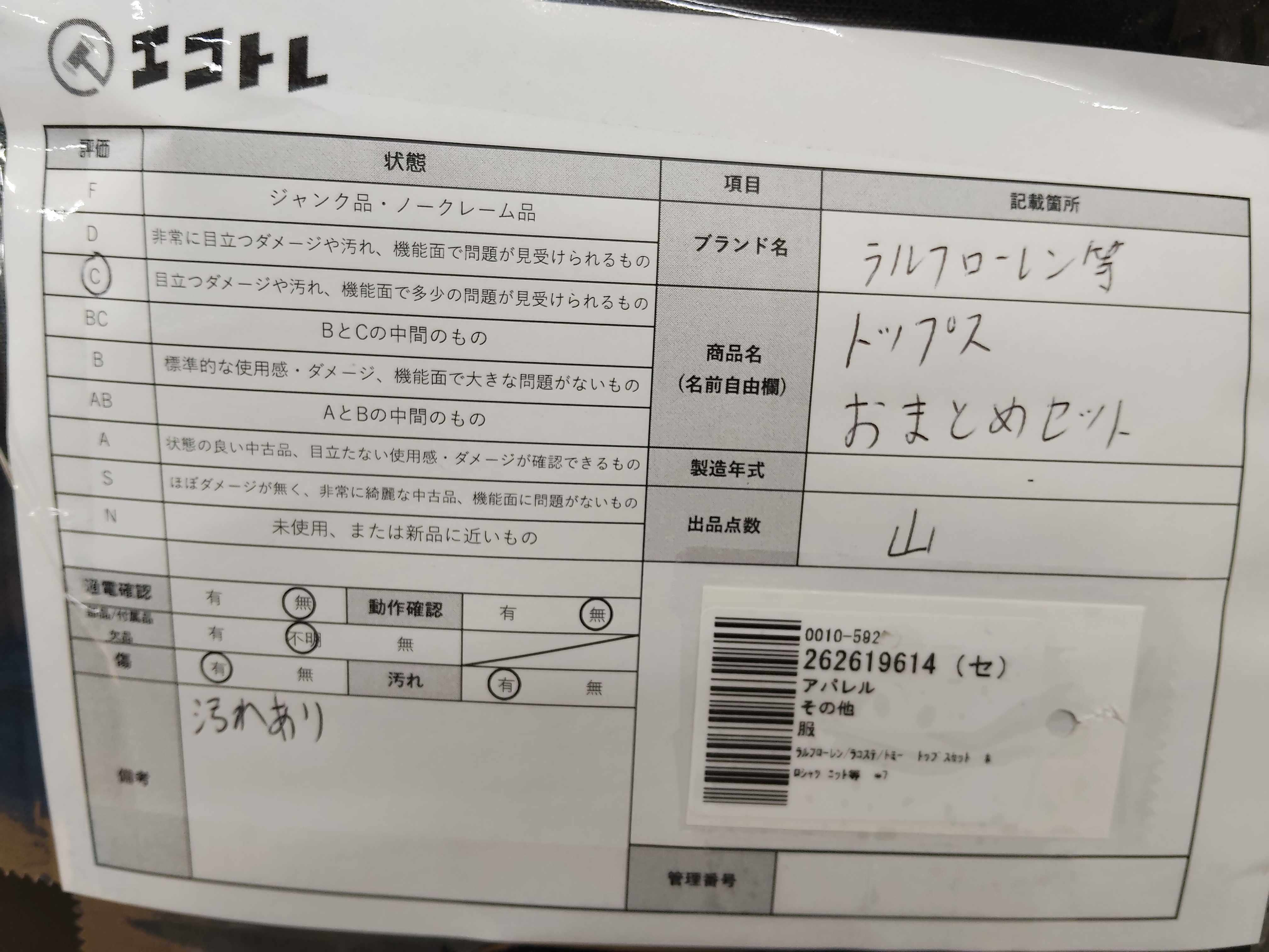 商品内容によって、JITBOXなどでの発送となる可能性がございます事ご理解下さい。年式などの商品情報詳細は写真にてご確認願います。※ご入札の際はご利用規約をよくお読みになってからのご参加お願いします。","タイプライン": "", "カテゴリ": "アパレル", "形状コード": "トップス", "付属品コード": "", "シリアル・シール・型番": ""