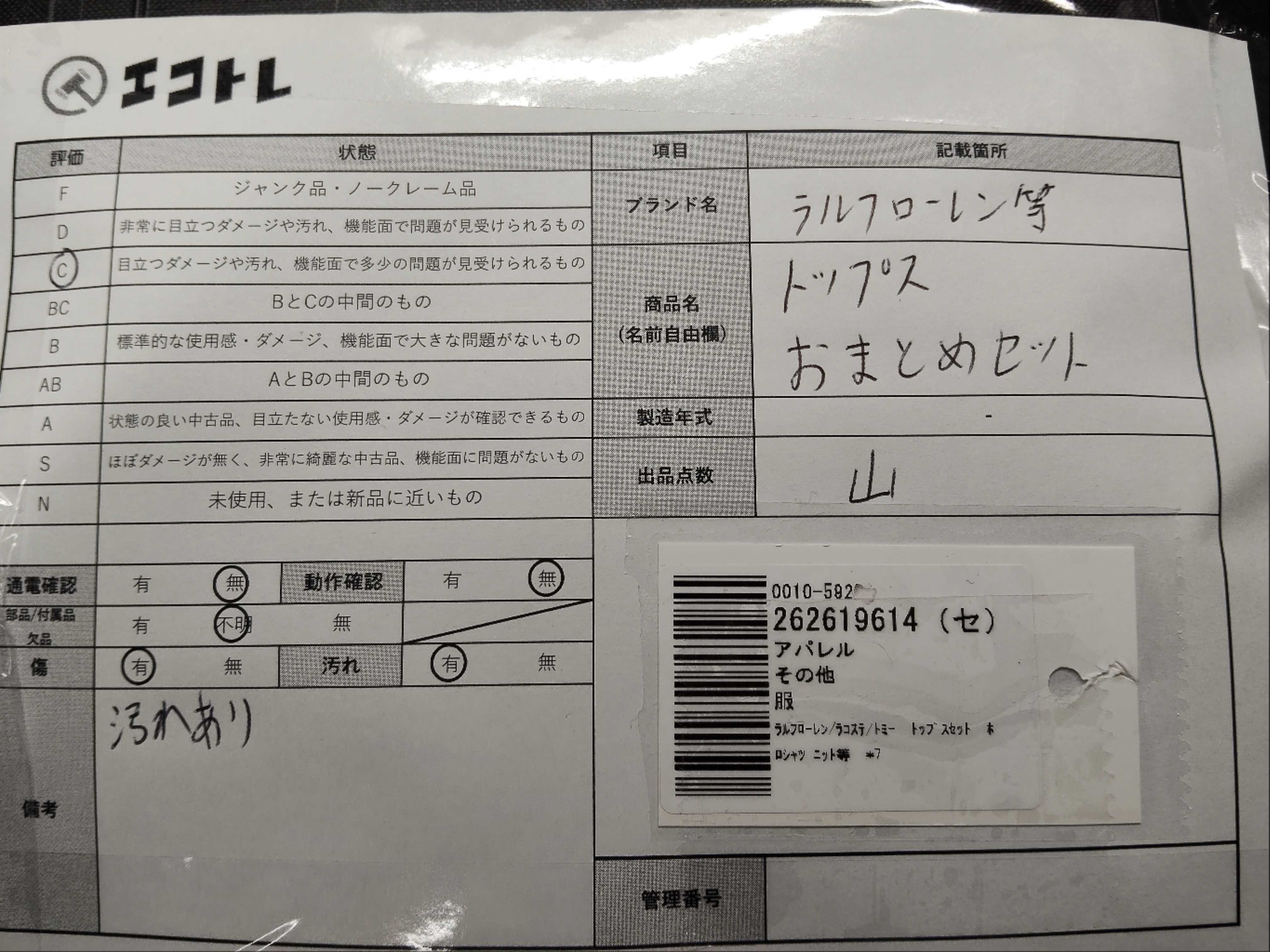 商品内容によって、JITBOXなどでの発送となる可能性がございます事ご理解下さい。年式などの商品情報詳細は写真にてご確認願います。※ご入札の際はご利用規約をよくお読みになってからのご参加お願いします。","タイプライン": "", "カテゴリ": "アパレル", "形状コード": "トップス", "付属品コード": "", "シリアル・シール・型番": ""