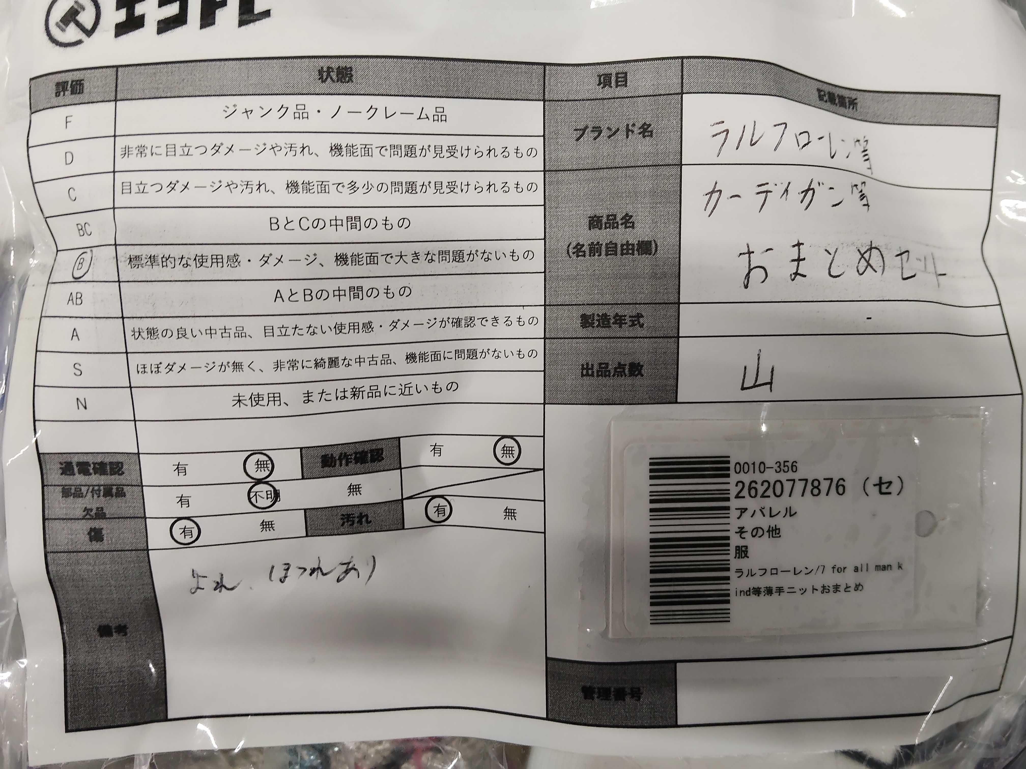 商品内容によって、JITBOXなどでの発送となる可能性がございます事ご理解下さい。年式などの商品情報詳細は写真にてご確認願います。※ご入札の際はご利用規約をよくお読みになってからのご参加お願いします。","タイプライン": "", "カテゴリ": "アパレル", "形状コード": "カーディガン", "付属品コード": "", "シリアル・シール・型番": ""