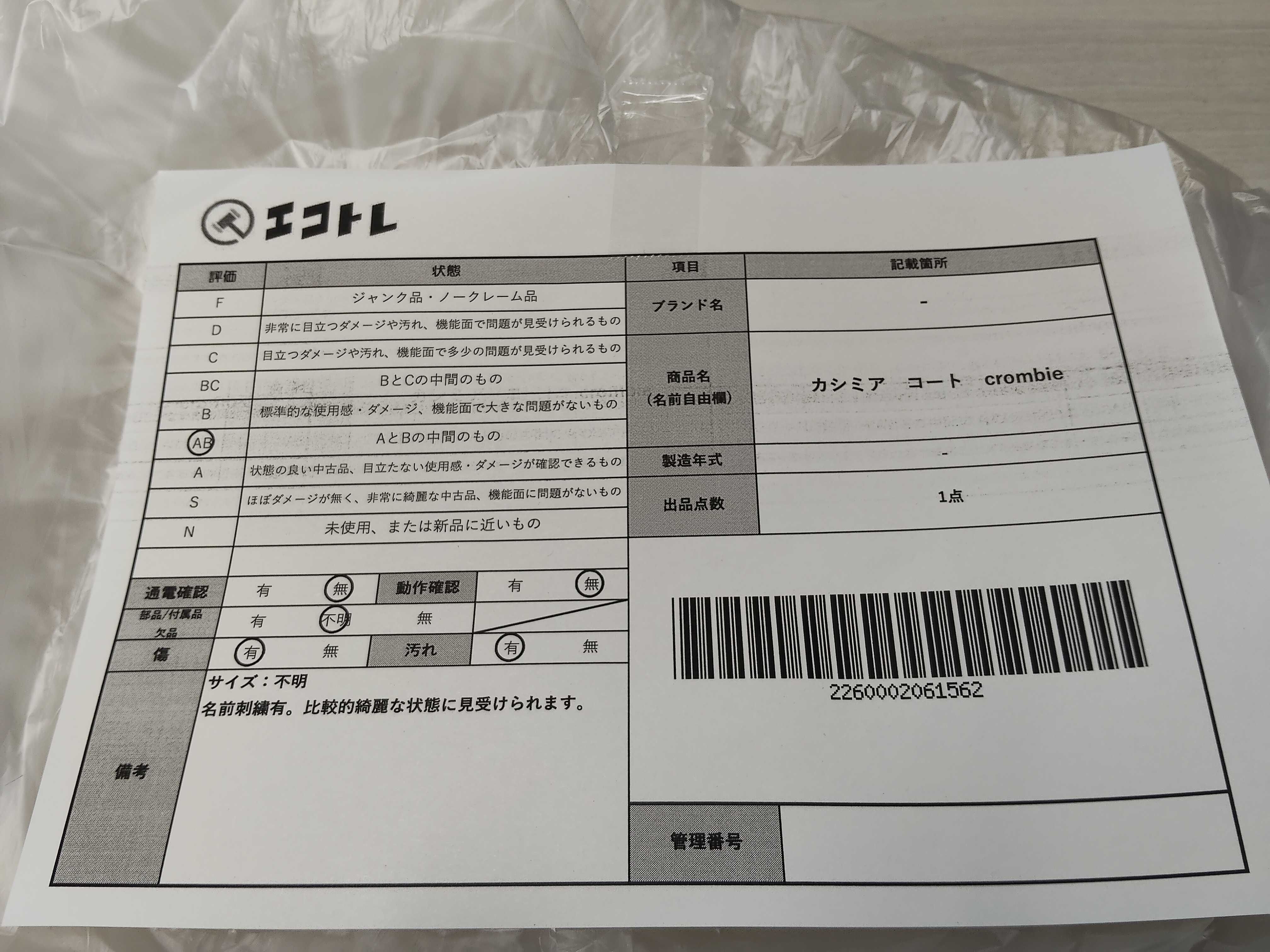 商品内容によって、JITBOXなどでの発送となる可能性がございます事ご理解下さい。年式などの商品情報詳細は写真にてご確認願います。※ご入札の際はご利用規約をよくお読みになってからのご参加お願いします。","タイプライン": "", "カテゴリ": "アパレル", "形状コード": "コート", "付属品コード": "", "シリアル・シール・型番": ""