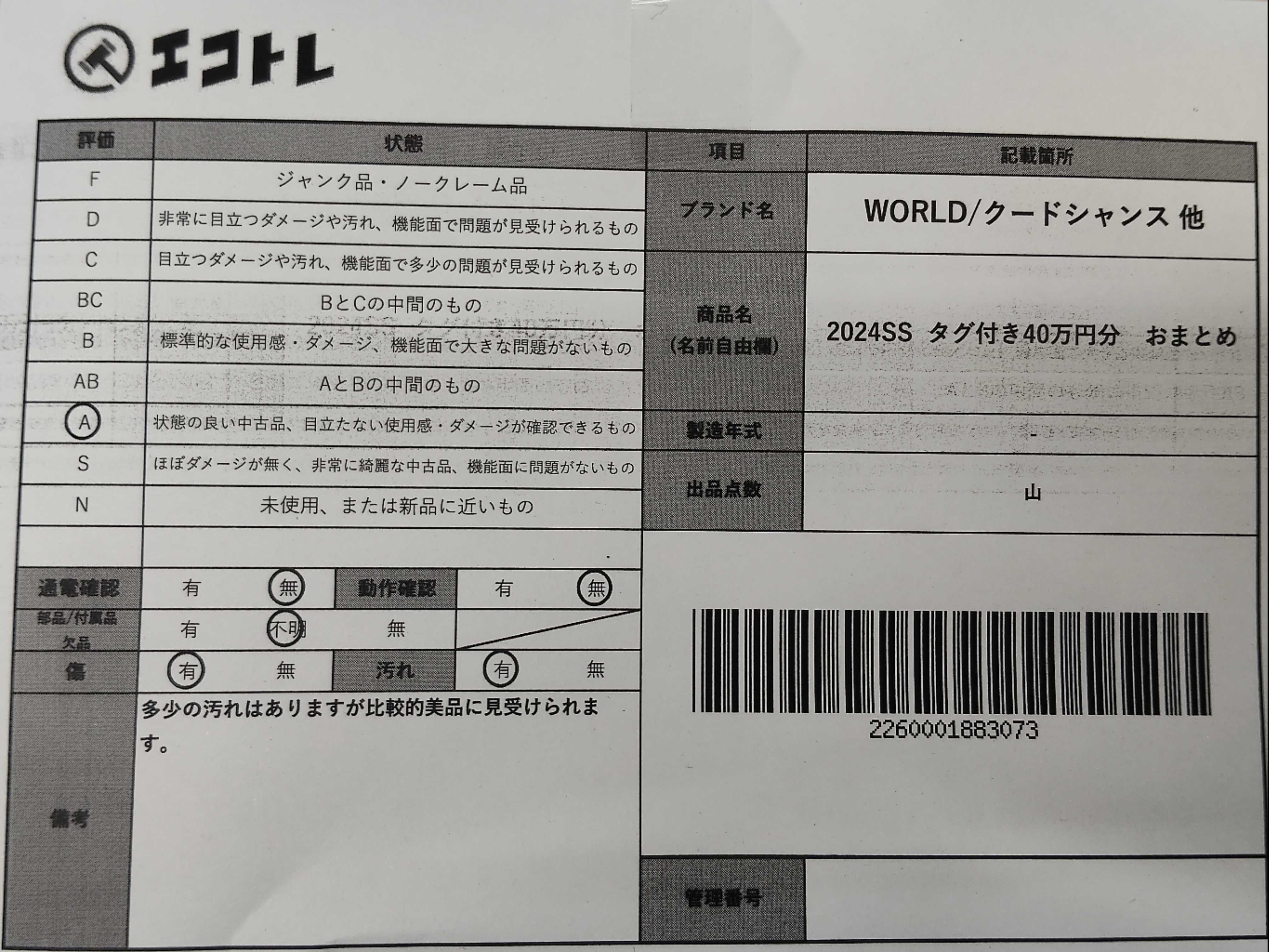 (11946_0446)▼WORLD 2024SS クードシャンス他 タグ付き40万円分 おまとめ その他アパレル