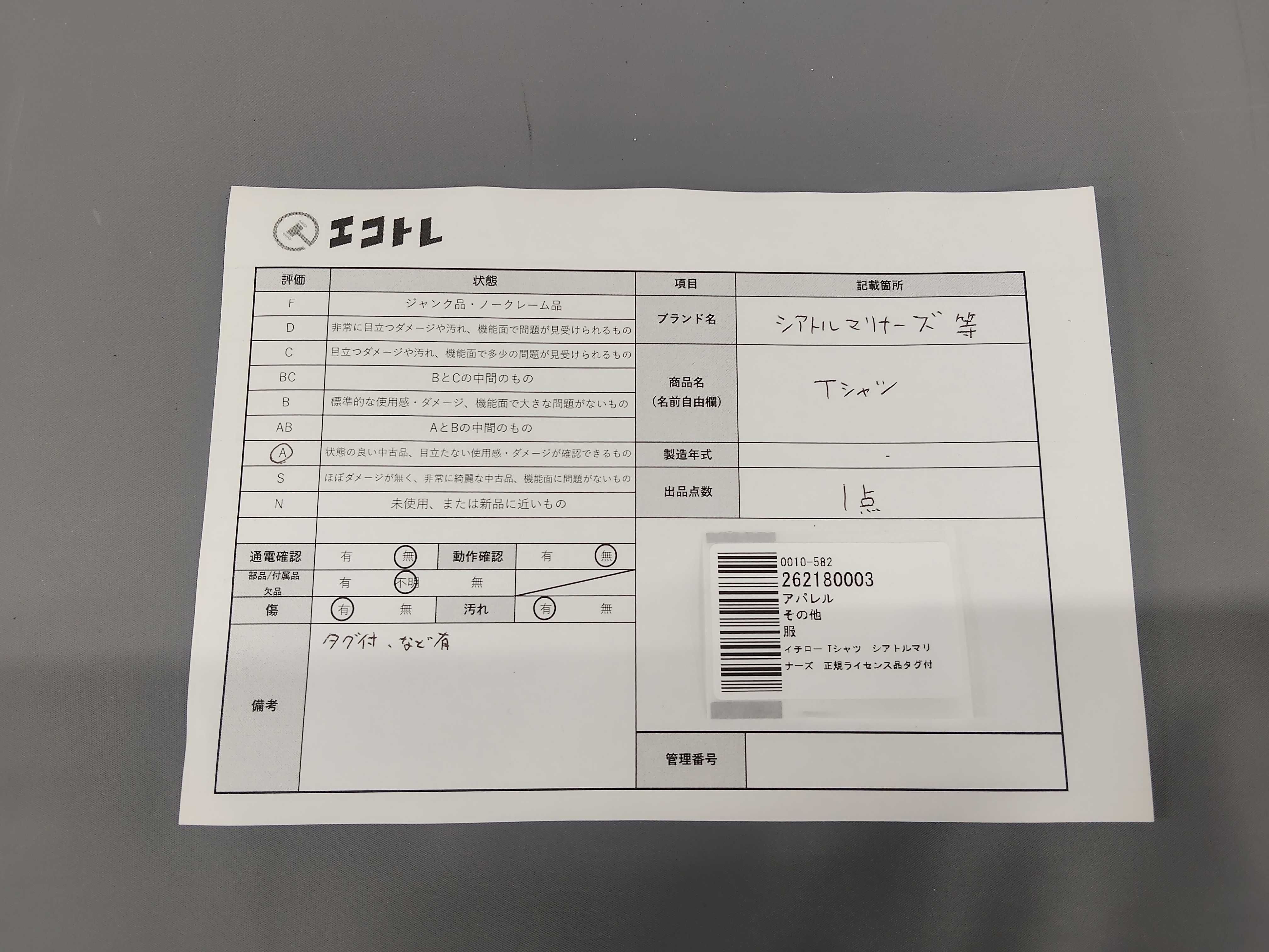 商品内容によって、JITBOXなどでの発送となる可能性がございます事ご理解下さい。年式などの商品情報詳細は写真にてご確認願います。※ご入札の際はご利用規約をよくお読みになってからのご参加お願いします。","タイプライン": "", "カテゴリ": "アパレル", "形状コード": "Tシャツ", "付属品コード": "", "シリアル・シール・型番": ""
