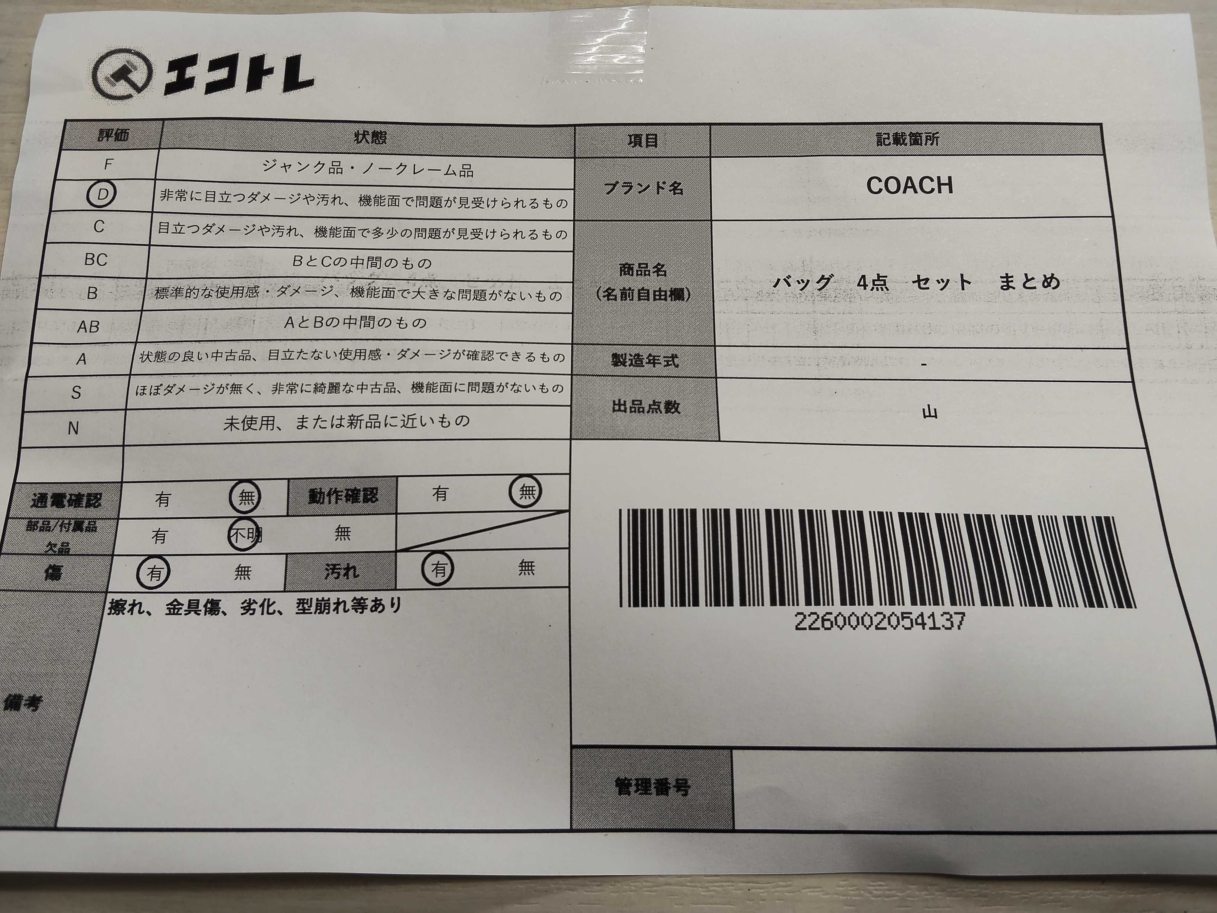 商品内容によって、JITBOXなどでの発送となる可能性がございます事ご理解下さい。年式などの商品情報詳細は写真にてご確認願います。※ご入札の際はご利用規約をよくお読みになってからのご参加お願いします。","タイプライン": "", "カテゴリ": "バッグ", "形状コード": "バッグ", "付属品コード": "", "シリアル・シール・型番": ""