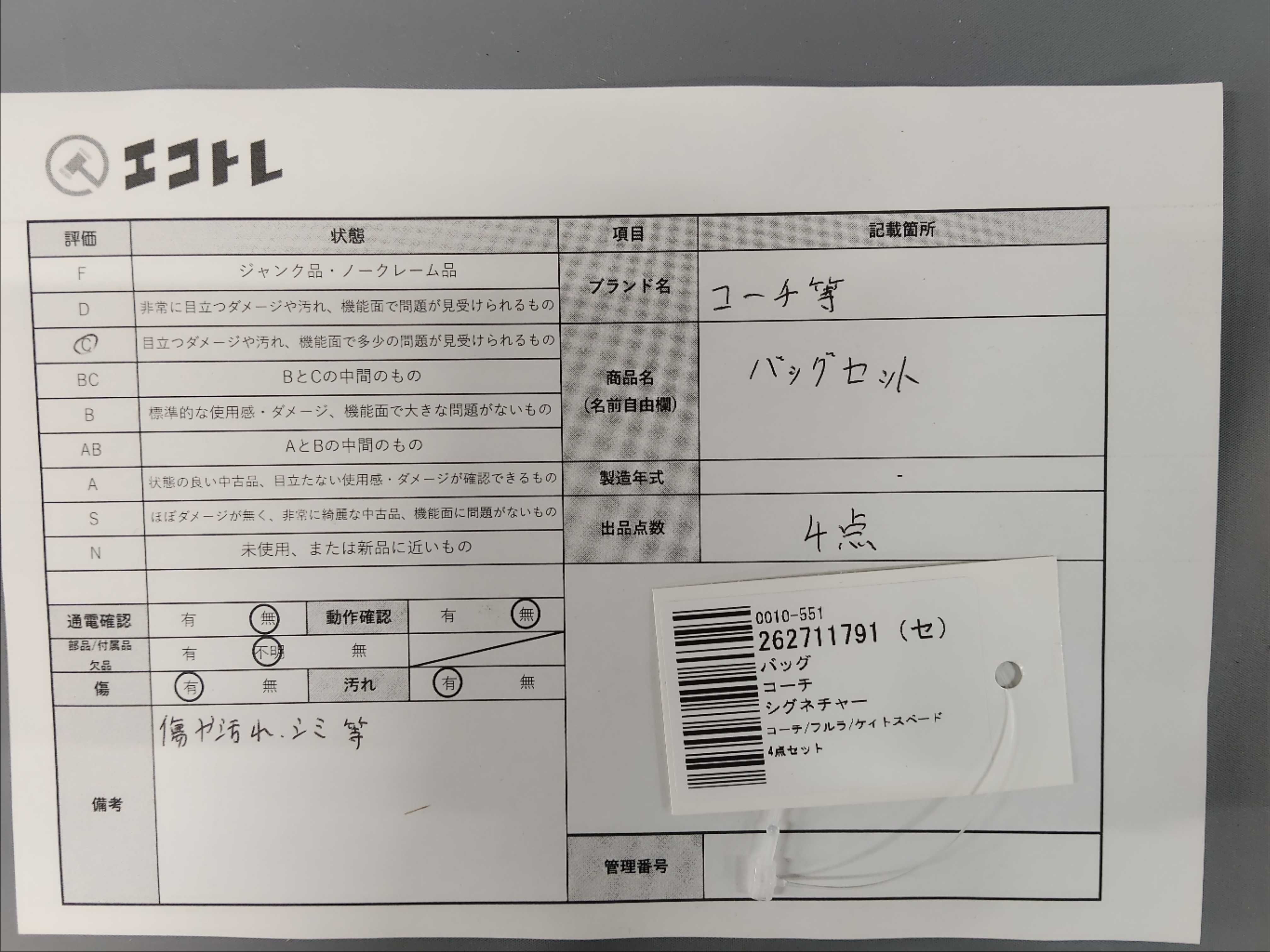 商品内容によって、JITBOXなどでの発送となる可能性がございます事ご理解下さい。年式などの商品情報詳細は写真にてご確認願います。※ご入札の際はご利用規約をよくお読みになってからのご参加お願いします。","タイプライン": "シグネチャー", "カテゴリ": "バッグ", "形状コード": "ハンドバッグ", "付属品コード": "", "シリアル・シール・型番": ""