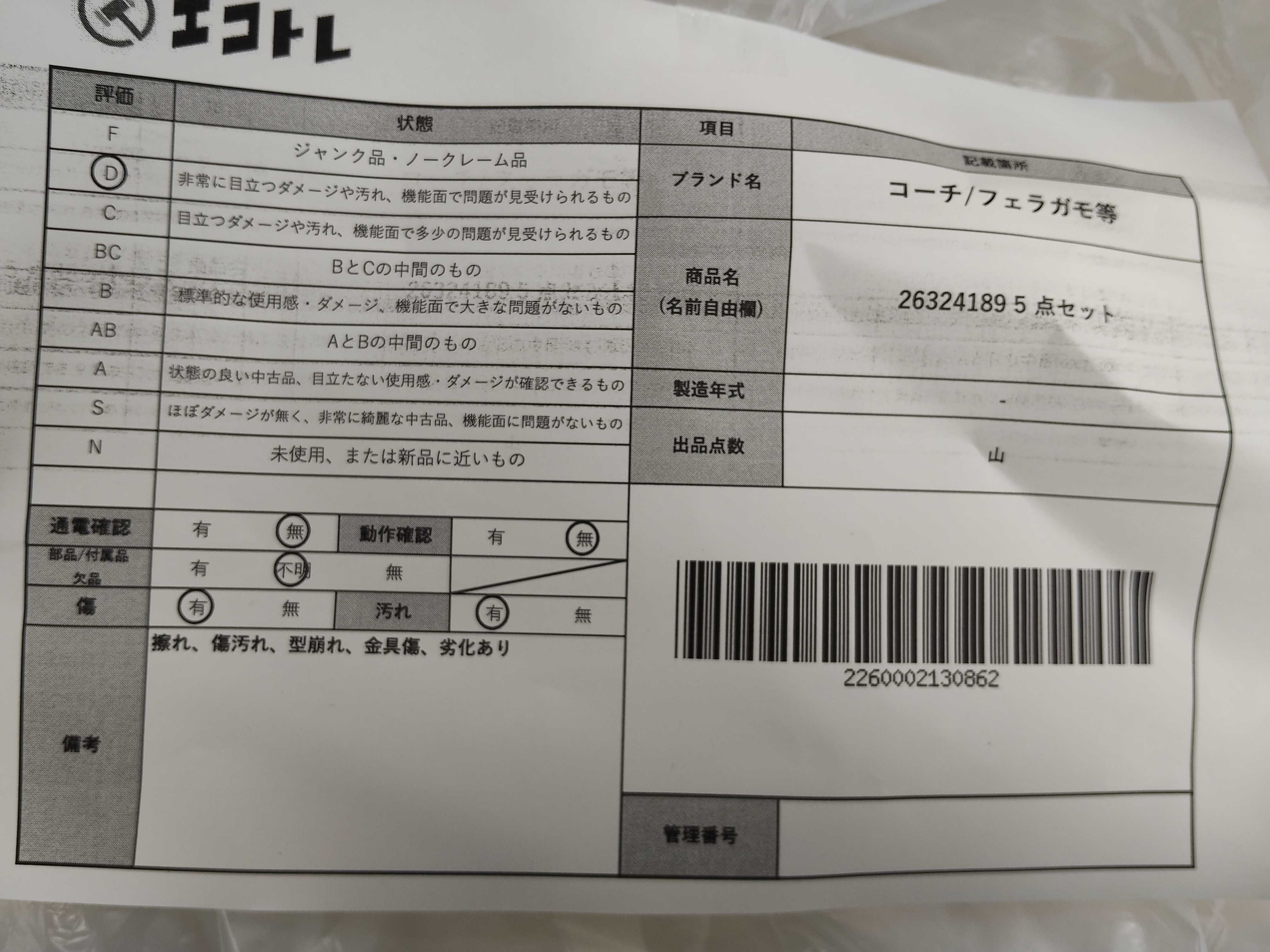 商品内容によって、JITBOXなどでの発送となる可能性がございます事ご理解下さい。年式などの商品情報詳細は写真にてご確認願います。※ご入札の際はご利用規約をよくお読みになってからのご参加お願いします。","タイプライン": "", "カテゴリ": "バッグ", "形状コード": "バッグ", "付属品コード": "", "シリアル・シール・型番": ""