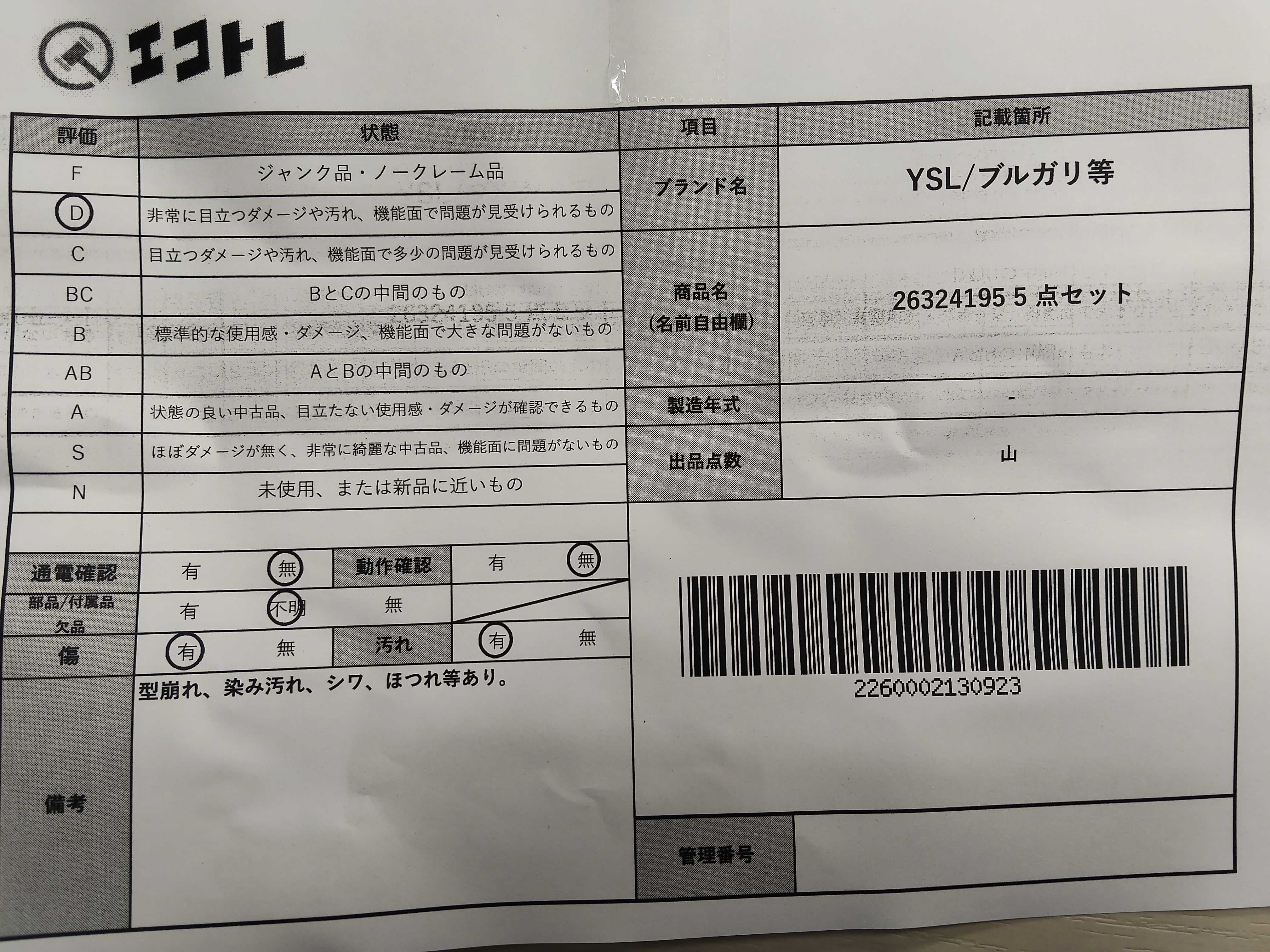商品内容によって、JITBOXなどでの発送となる可能性がございます事ご理解下さい。年式などの商品情報詳細は写真にてご確認願います。※ご入札の際はご利用規約をよくお読みになってからのご参加お願いします。","タイプライン": "", "カテゴリ": "バッグ", "形状コード": "バッグ", "付属品コード": "", "シリアル・シール・型番": ""