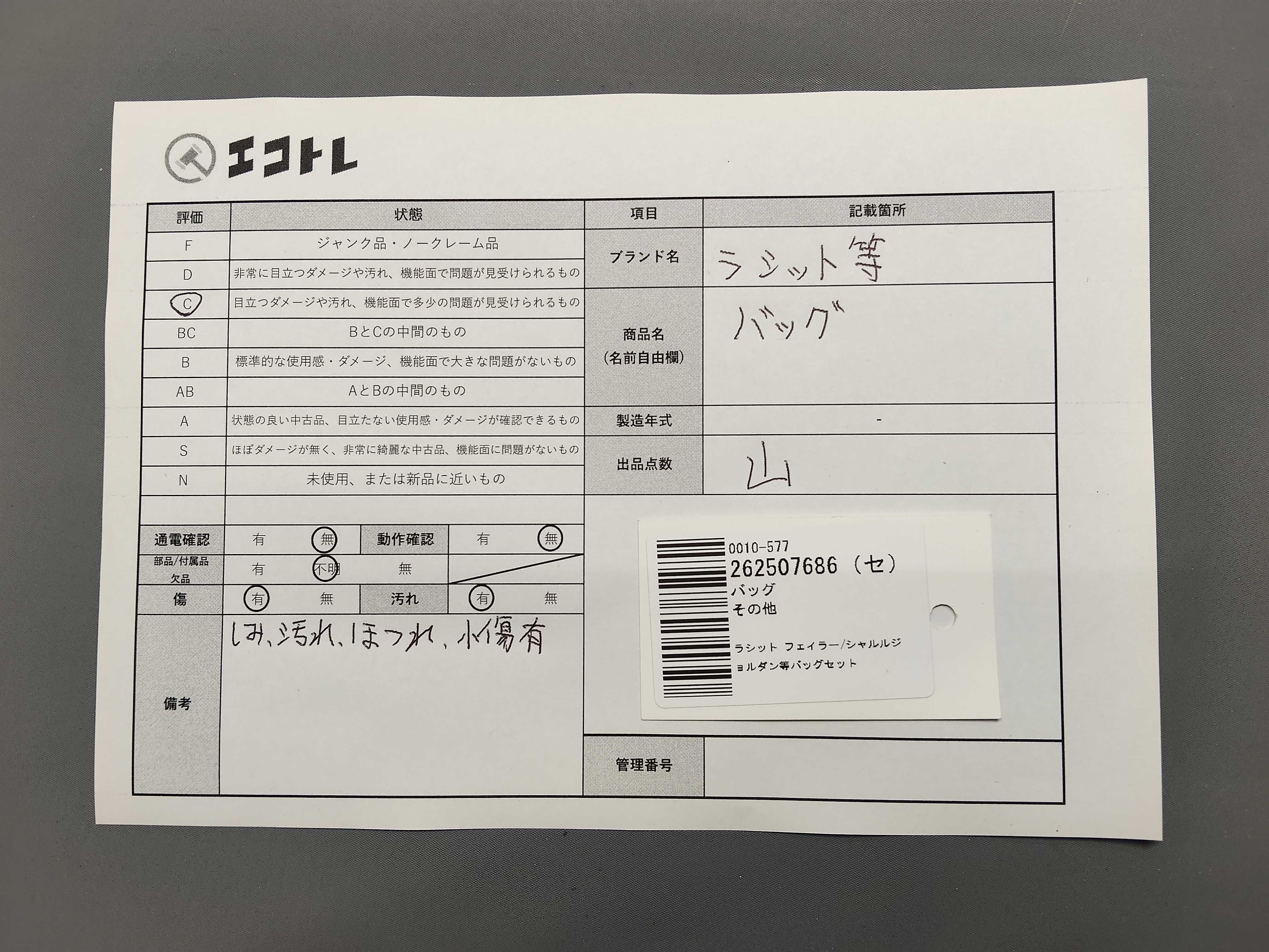 商品内容によって、JITBOXなどでの発送となる可能性がございます事ご理解下さい。年式などの商品情報詳細は写真にてご確認願います。※ご入札の際はご利用規約をよくお読みになってからのご参加お願いします。","タイプライン": "", "カテゴリ": "バッグ", "形状コード": "バッグ", "付属品コード": "", "シリアル・シール・型番": ""