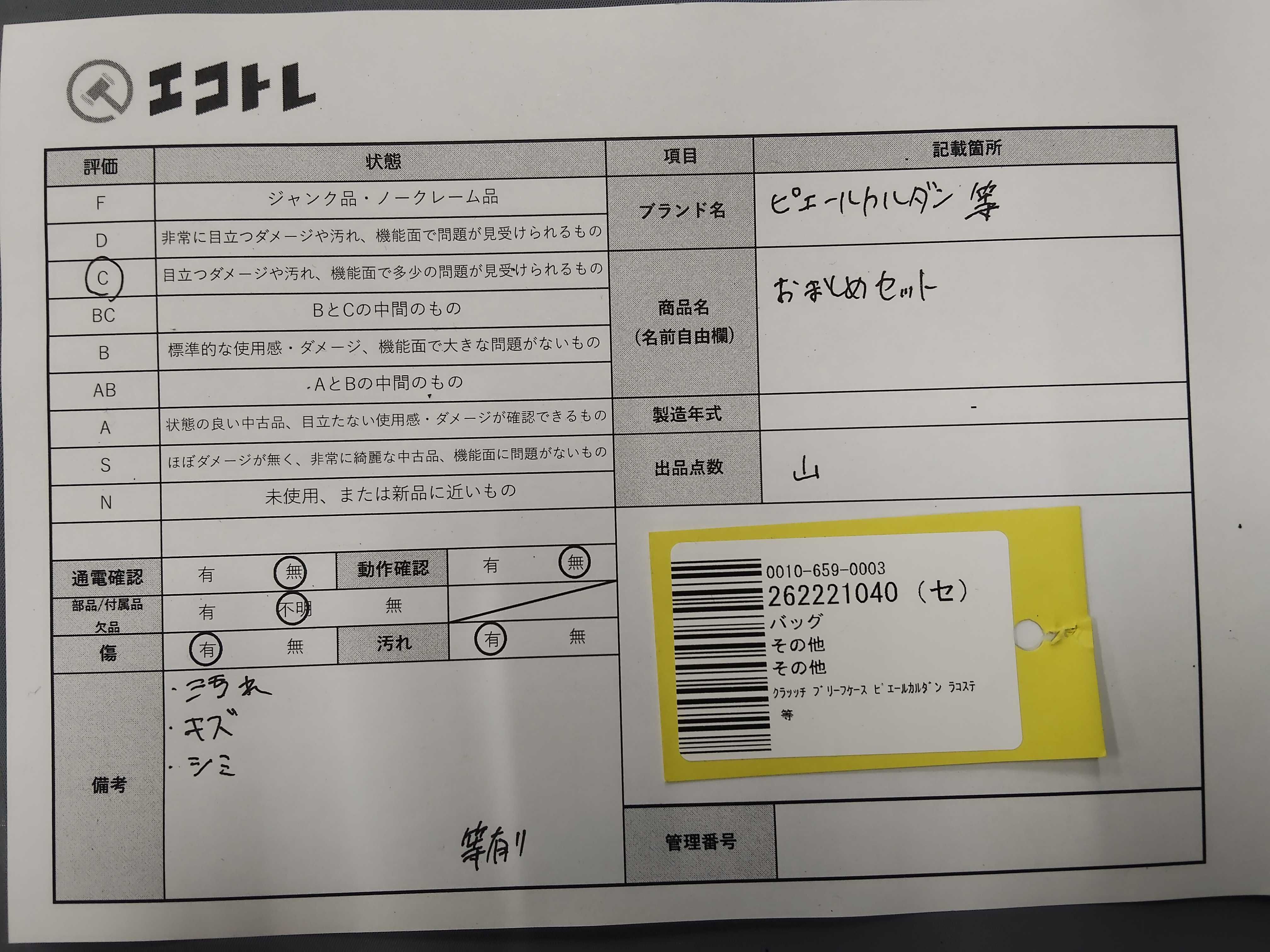 商品内容によって、JITBOXなどでの発送となる可能性がございます事ご理解下さい。年式などの商品情報詳細は写真にてご確認願います。※ご入札の際はご利用規約をよくお読みになってからのご参加お願いします。","タイプライン": "", "カテゴリ": "バッグ", "形状コード": "クラッチバッグ", "付属品コード": "", "シリアル・シール・型番": ""