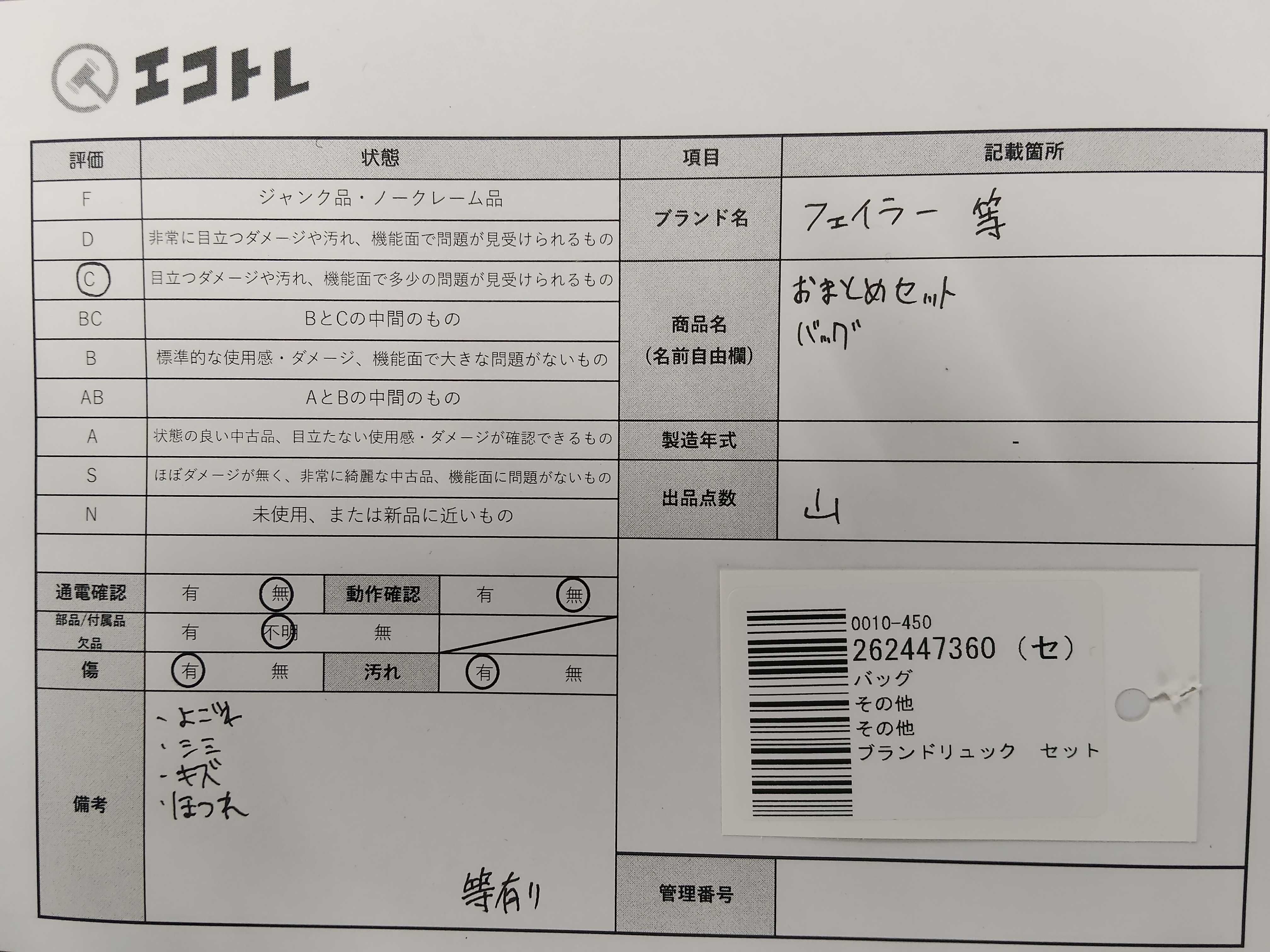 商品内容によって、JITBOXなどでの発送となる可能性がございます事ご理解下さい。年式などの商品情報詳細は写真にてご確認願います。※ご入札の際はご利用規約をよくお読みになってからのご参加お願いします。","タイプライン": "", "カテゴリ": "バッグ", "形状コード": "リュックサック", "付属品コード": "", "シリアル・シール・型番": ""