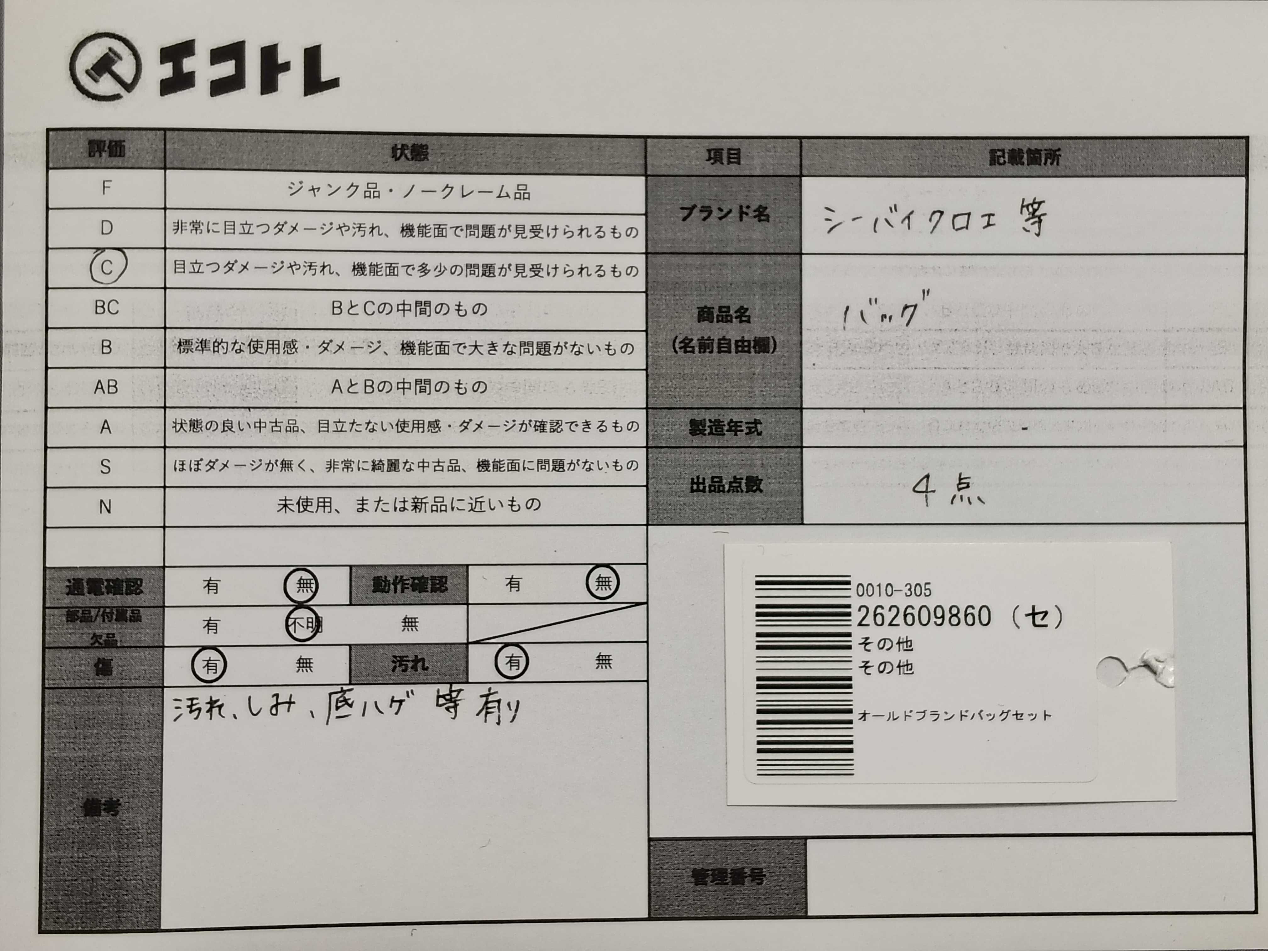 商品内容によって、JITBOXなどでの発送となる可能性がございます事ご理解下さい。年式などの商品情報詳細は写真にてご確認願います。※ご入札の際はご利用規約をよくお読みになってからのご参加お願いします。","タイプライン": "", "カテゴリ": "バッグ", "形状コード": "ハンドバッグ", "付属品コード": "", "シリアル・シール・型番": ""