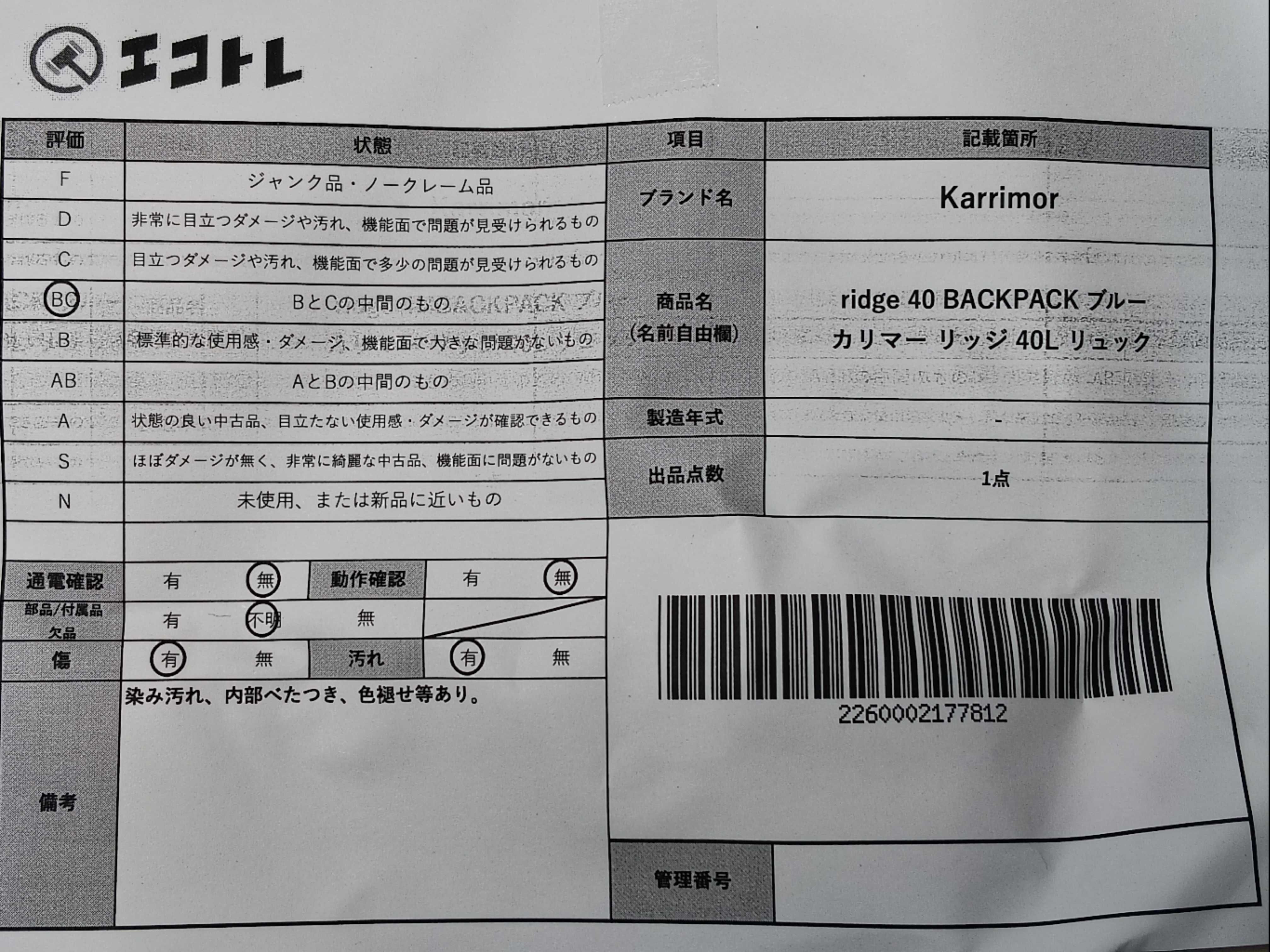 商品内容によって、JITBOXなどでの発送となる可能性がございます事ご理解下さい。年式などの商品情報詳細は写真にてご確認願います。※ご入札の際はご利用規約をよくお読みになってからのご参加お願いします。","タイプライン": "", "カテゴリ": "バッグ", "形状コード": "リュックサック", "付属品コード": "", "シリアル・シール・型番": ""
