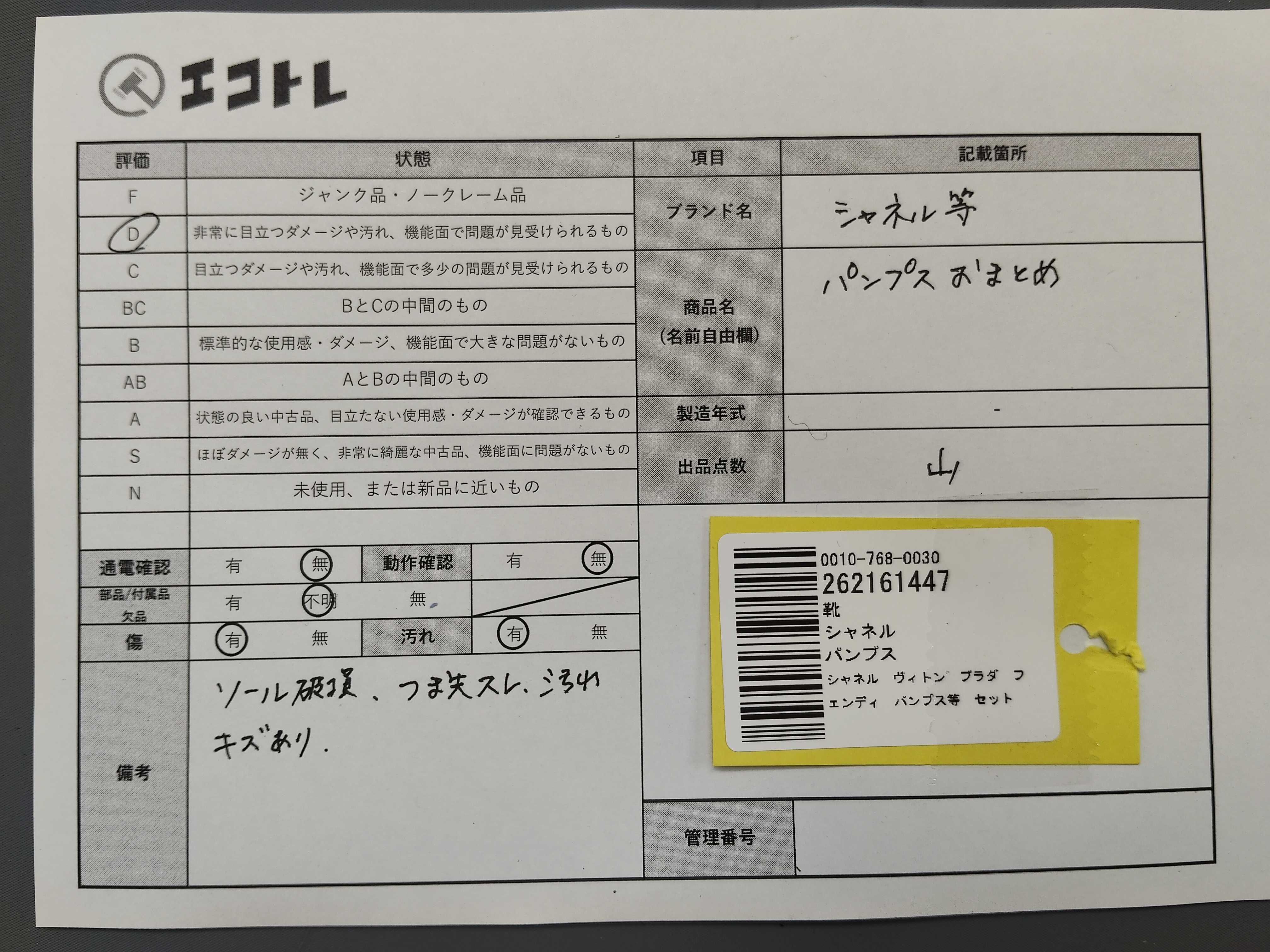 商品内容によって、JITBOXなどでの発送となる可能性がございます事ご理解下さい。年式などの商品情報詳細は写真にてご確認願います。※ご入札の際はご利用規約をよくお読みになってからのご参加お願いします。","タイプライン": "", "カテゴリ": "靴", "形状コード": "パンプス", "付属品コード": "", "シリアル・シール・型番": ""