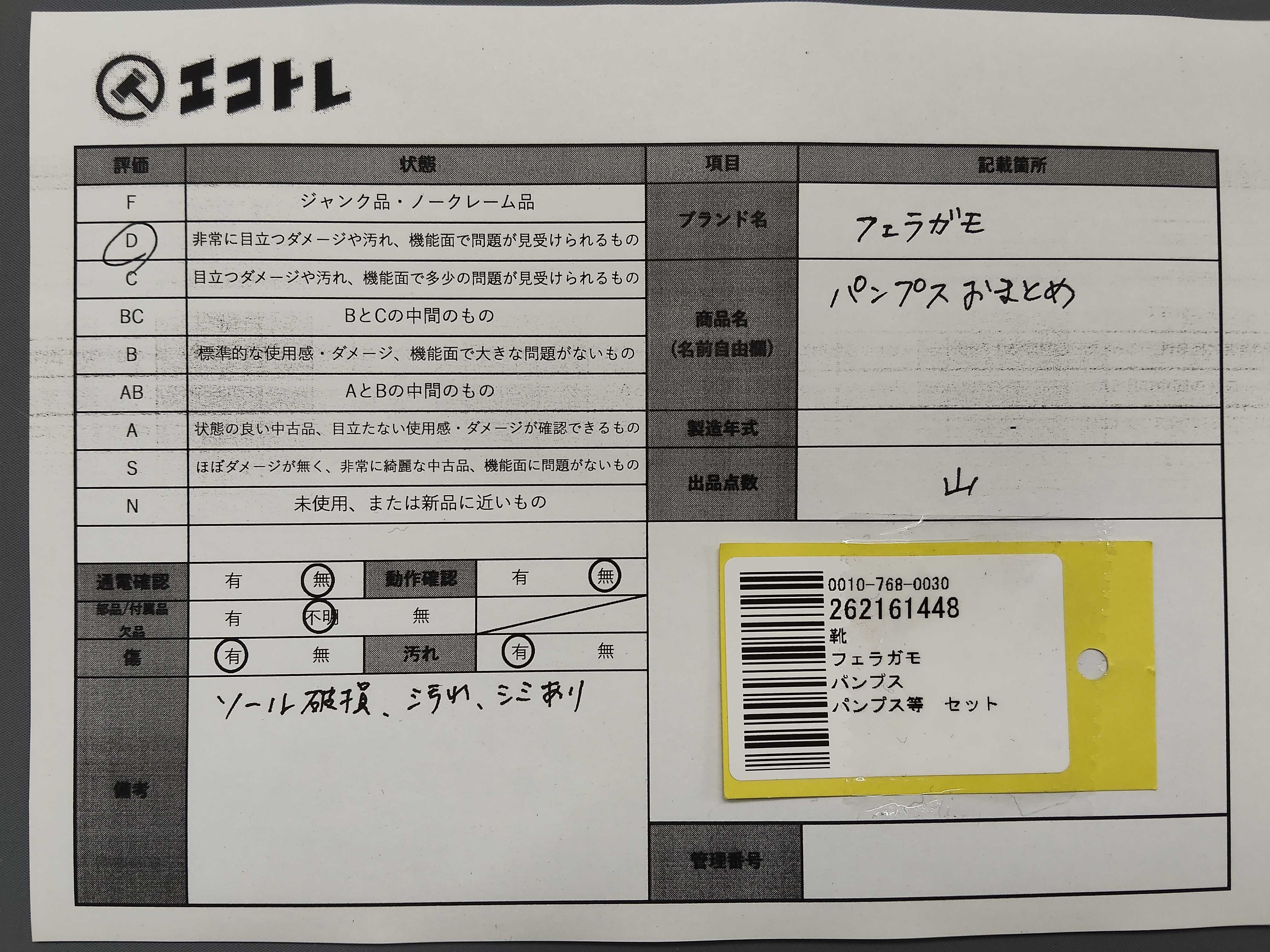 商品内容によって、JITBOXなどでの発送となる可能性がございます事ご理解下さい。年式などの商品情報詳細は写真にてご確認願います。※ご入札の際はご利用規約をよくお読みになってからのご参加お願いします。","タイプライン": "", "カテゴリ": "靴", "形状コード": "パンプス", "付属品コード": "", "シリアル・シール・型番": ""