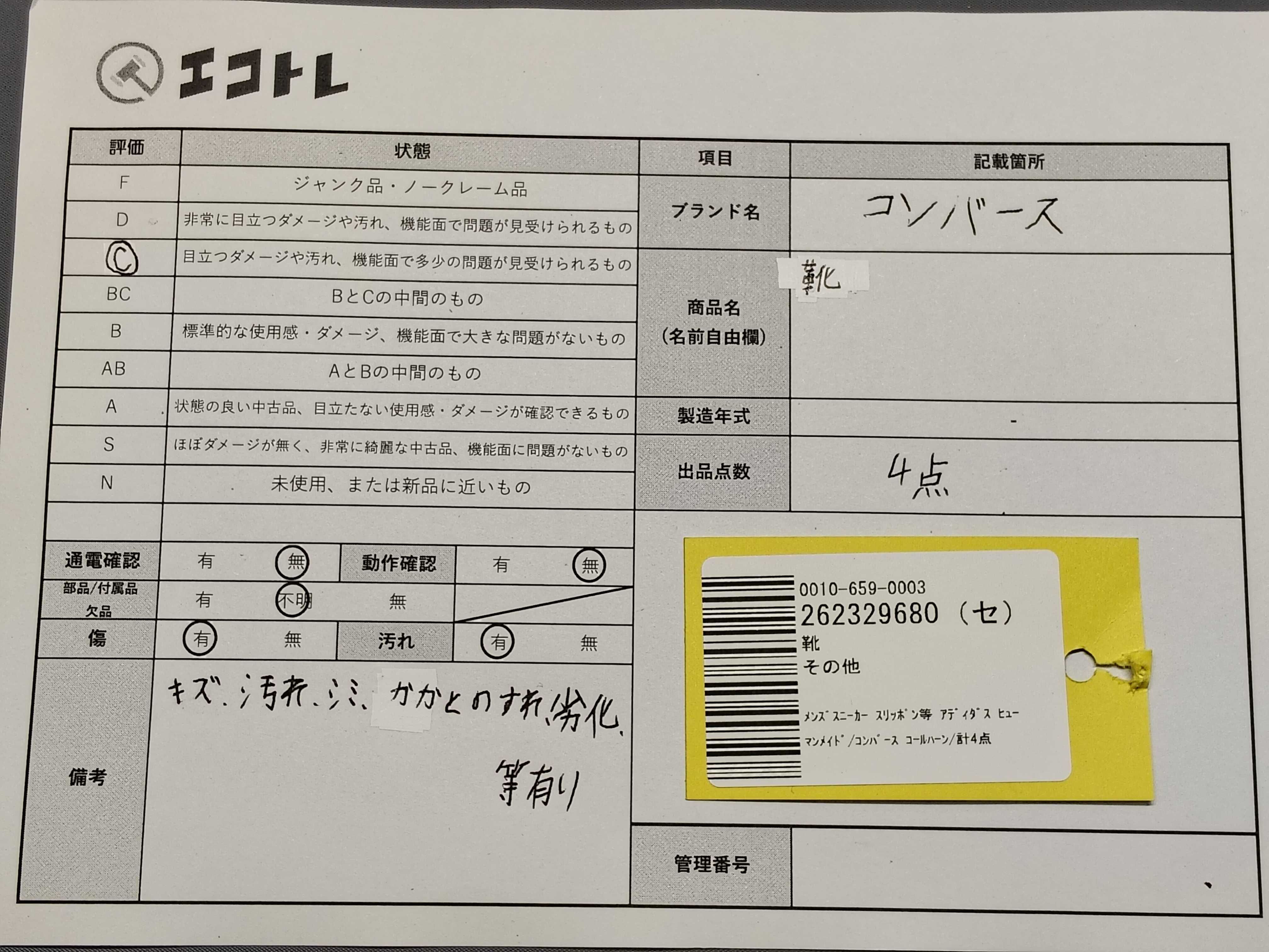 商品内容によって、JITBOXなどでの発送となる可能性がございます事ご理解下さい。年式などの商品情報詳細は写真にてご確認願います。※ご入札の際はご利用規約をよくお読みになってからのご参加お願いします。","タイプライン": "", "カテゴリ": "靴", "形状コード": "その他靴", "付属品コード": "", "シリアル・シール・型番": ""