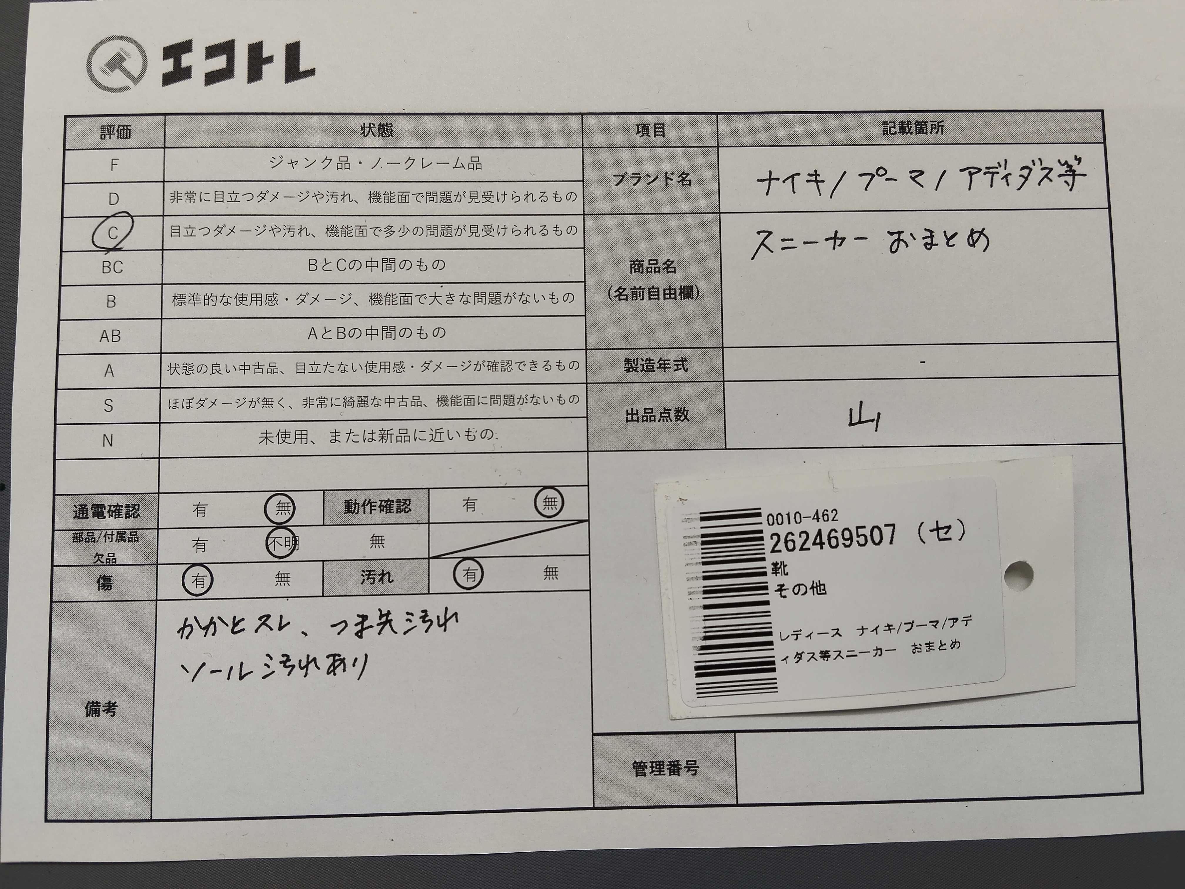 商品内容によって、JITBOXなどでの発送となる可能性がございます事ご理解下さい。年式などの商品情報詳細は写真にてご確認願います。※ご入札の際はご利用規約をよくお読みになってからのご参加お願いします。","タイプライン": "", "カテゴリ": "靴", "形状コード": "スニーカー", "付属品コード": "", "シリアル・シール・型番": ""