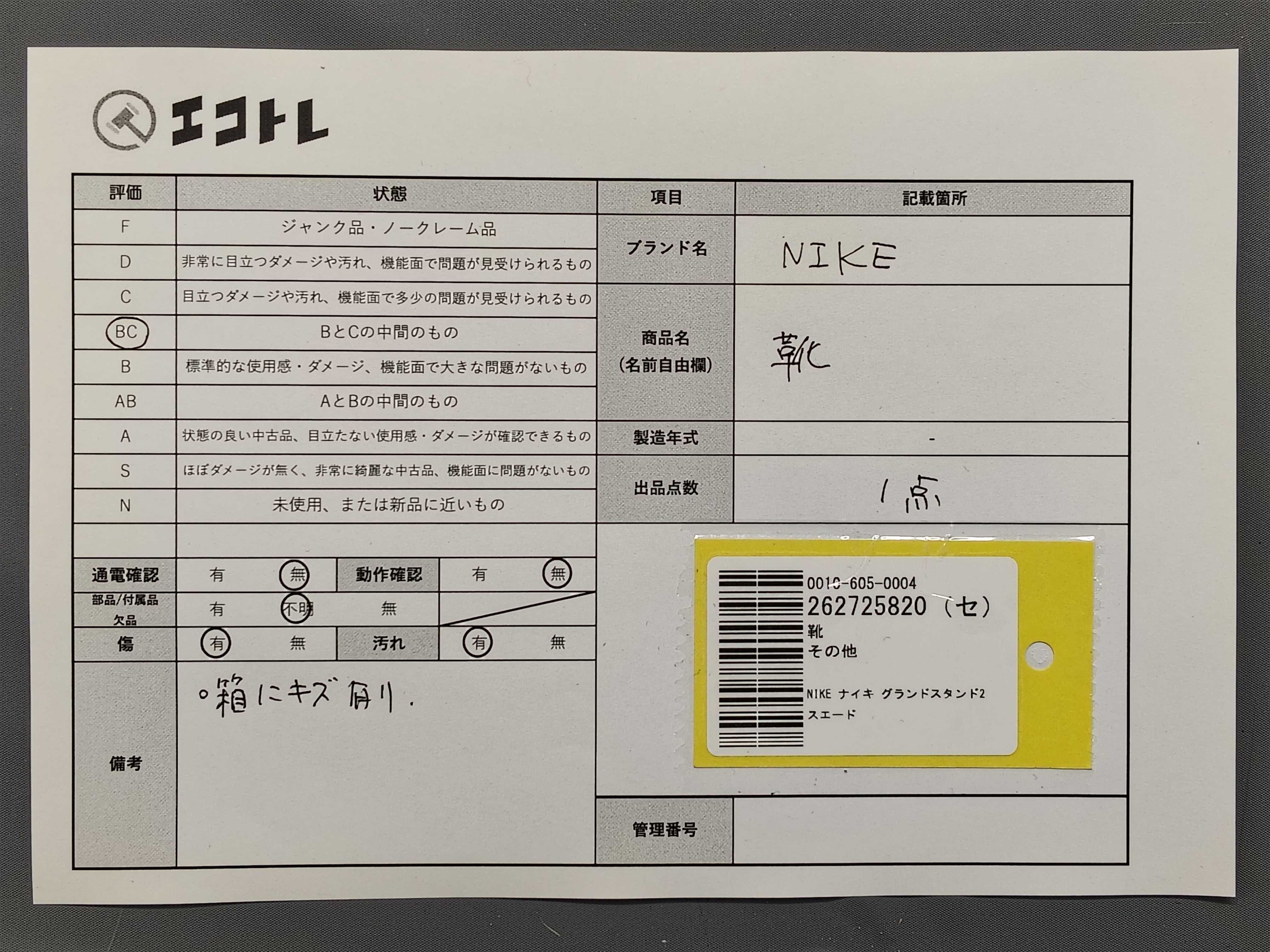 商品内容によって、JITBOXなどでの発送となる可能性がございます事ご理解下さい。年式などの商品情報詳細は写真にてご確認願います。※ご入札の際はご利用規約をよくお読みになってからのご参加お願いします。","タイプライン": "", "カテゴリ": "靴", "形状コード": "スニーカー", "付属品コード": "", "シリアル・シール・型番": ""