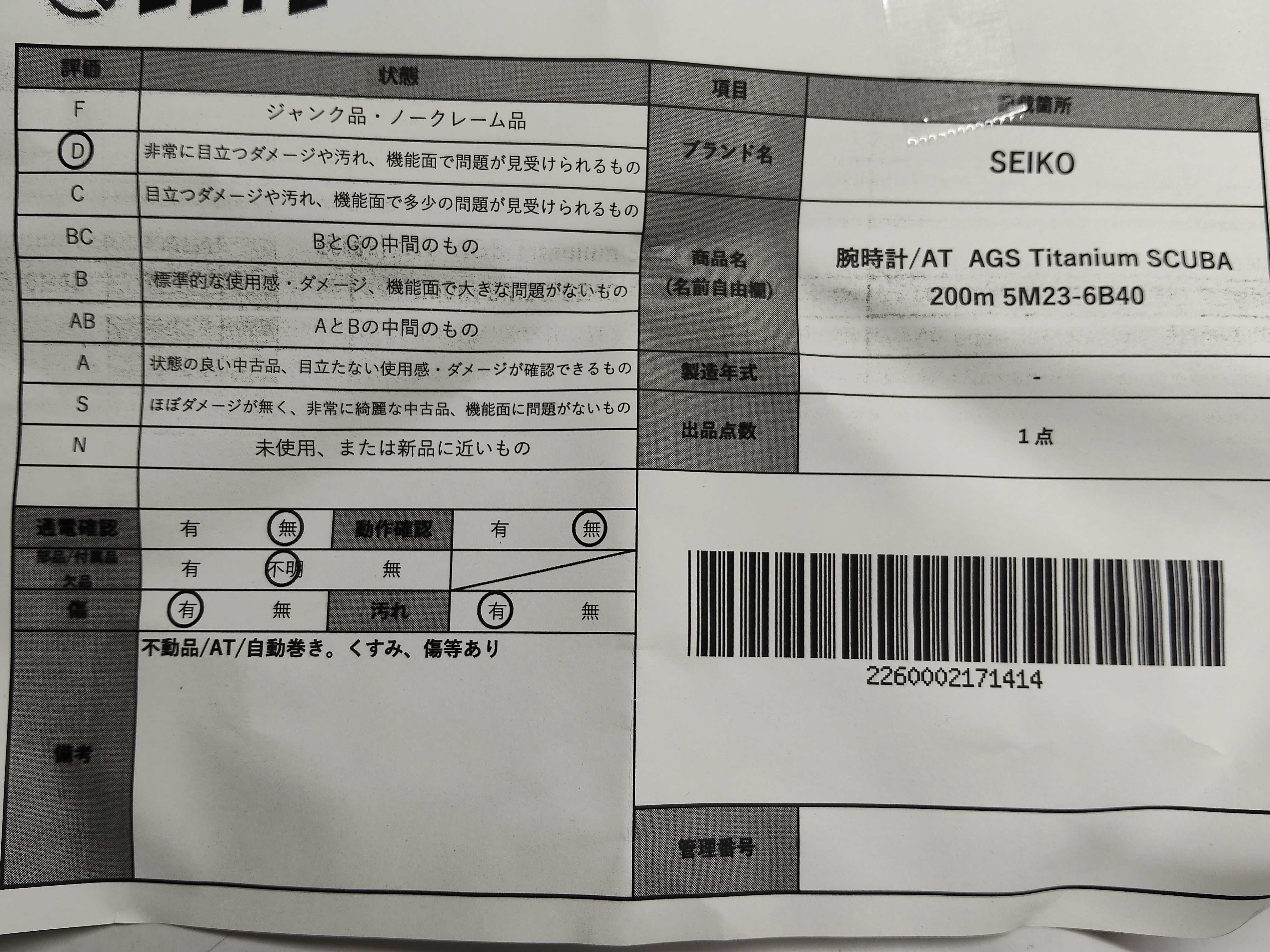 商品内容によって、JITBOXなどでの発送となる可能性がございます事ご理解下さい。年式などの商品情報詳細は写真にてご確認願います。※ご入札の際はご利用規約をよくお読みになってからのご参加お願いします。","タイプライン": "", "カテゴリ": "時計", "形状コード": "ボーイズ腕時計", "付属品コード": "", "シリアル・シール・型番": ""