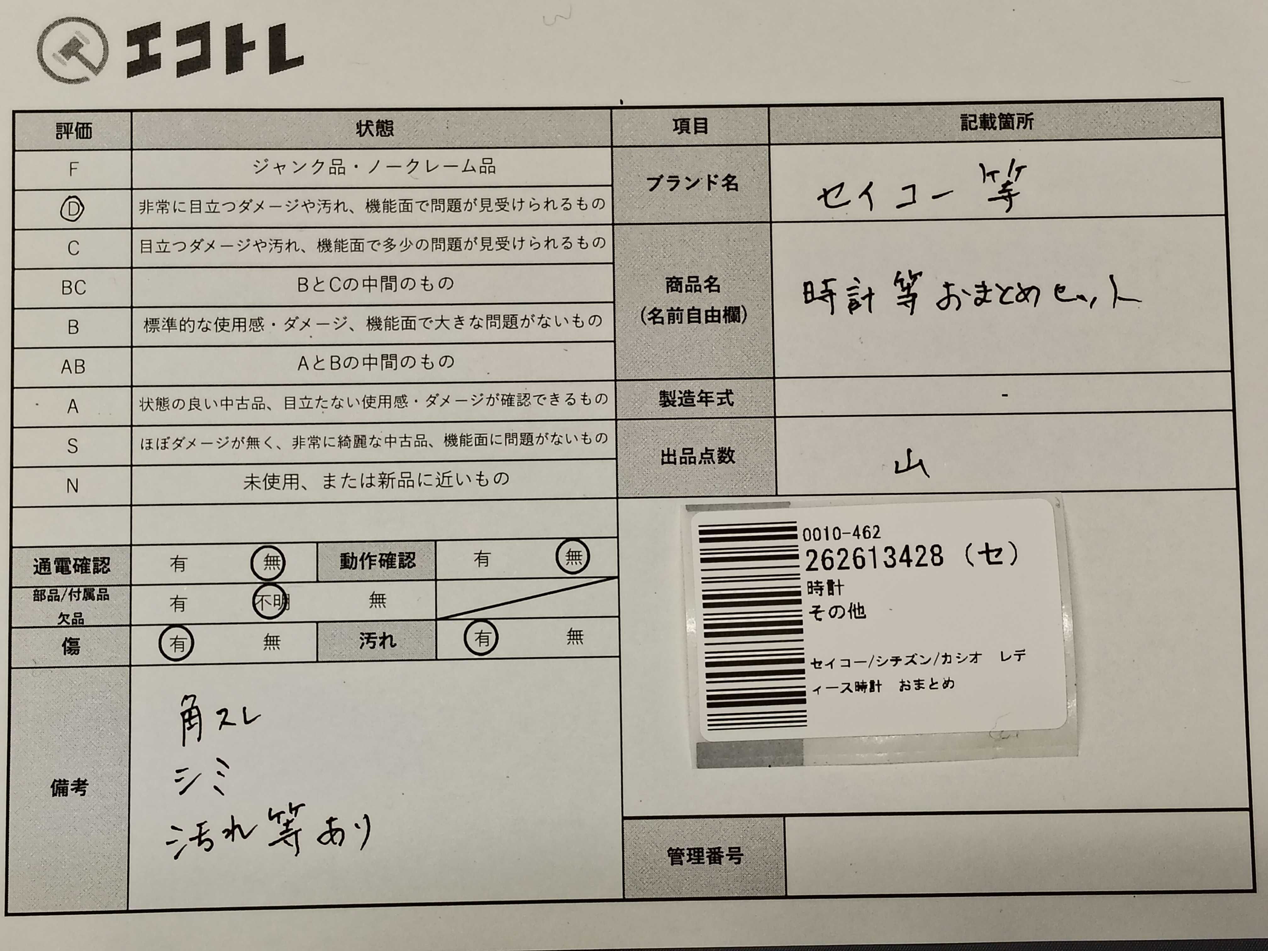商品内容によって、JITBOXなどでの発送となる可能性がございます事ご理解下さい。年式などの商品情報詳細は写真にてご確認願います。※ご入札の際はご利用規約をよくお読みになってからのご参加お願いします。","タイプライン": "", "カテゴリ": "時計", "形状コード": "時計まとめ", "付属品コード": "", "シリアル・シール・型番": ""