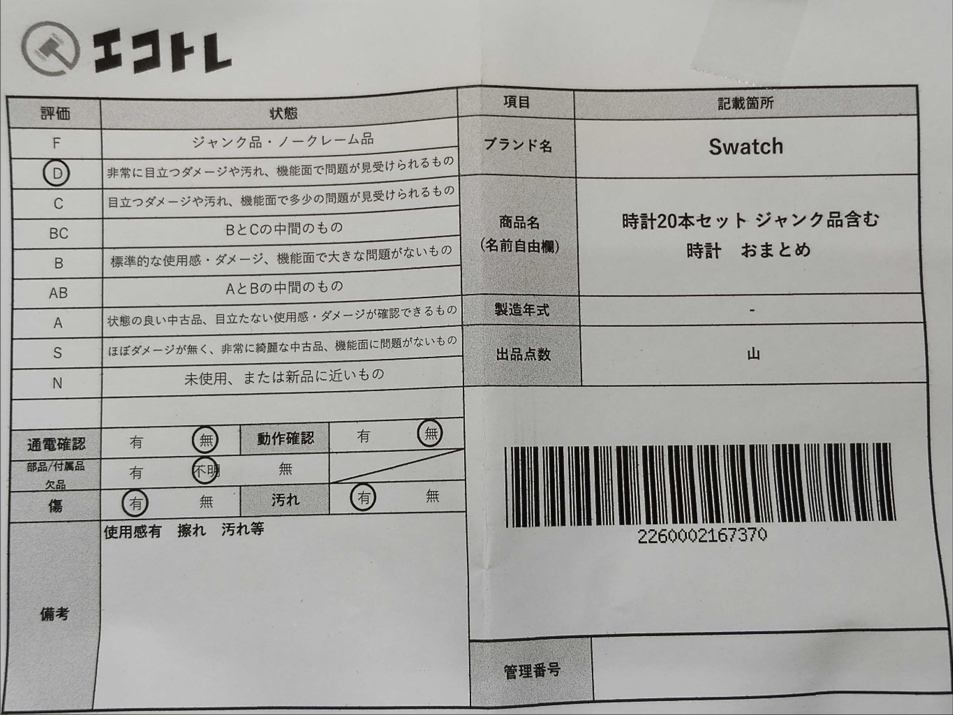 商品内容によって、JITBOXなどでの発送となる可能性がございます事ご理解下さい。年式などの商品情報詳細は写真にてご確認願います。※ご入札の際はご利用規約をよくお読みになってからのご参加お願いします。","タイプライン": "", "カテゴリ": "時計", "形状コード": "時計まとめ", "付属品コード": "", "シリアル・シール・型番": ""