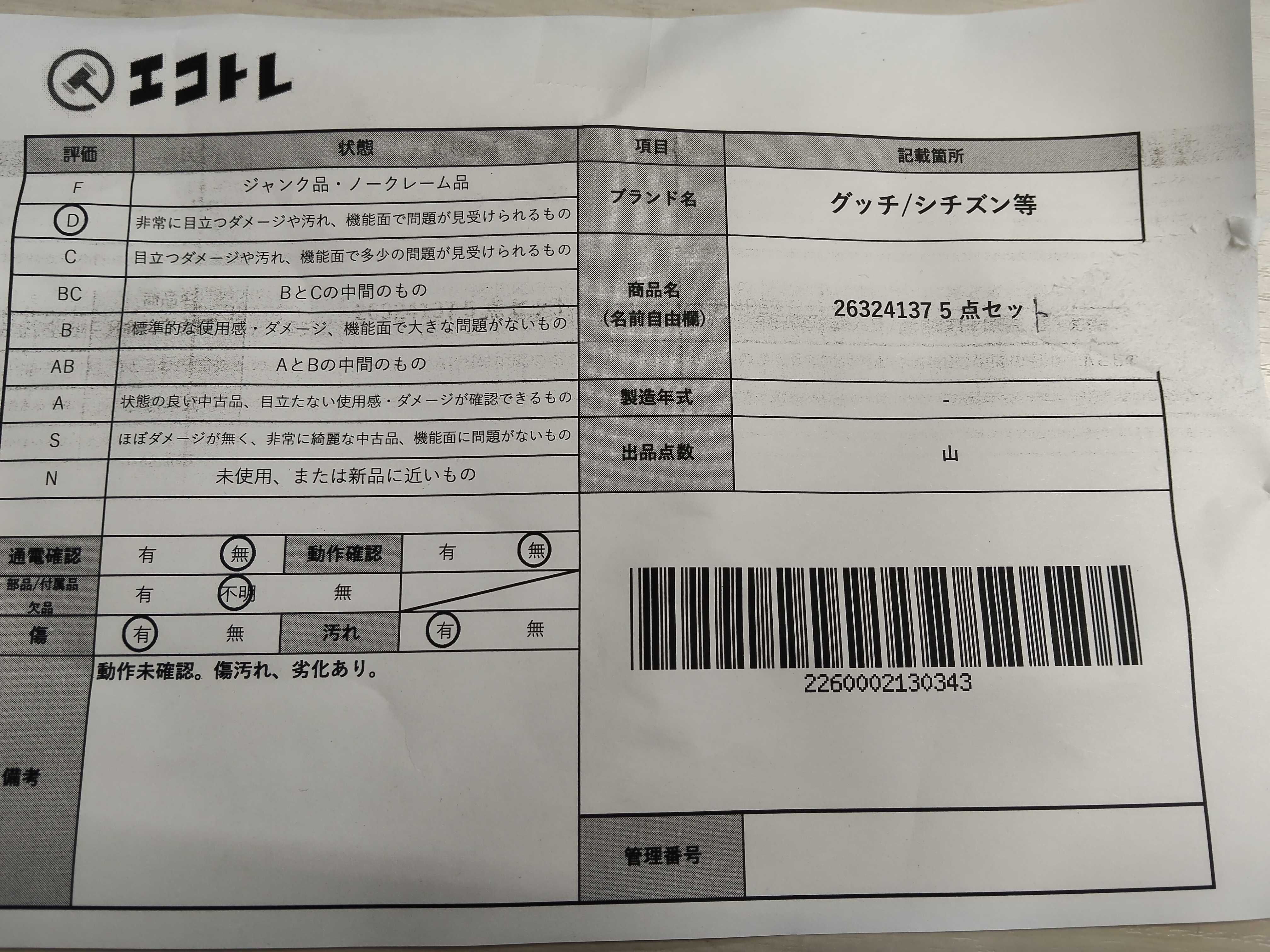 商品内容によって、JITBOXなどでの発送となる可能性がございます事ご理解下さい。年式などの商品情報詳細は写真にてご確認願います。※ご入札の際はご利用規約をよくお読みになってからのご参加お願いします。","タイプライン": "", "カテゴリ": "時計", "形状コード": "時計まとめ", "付属品コード": "", "シリアル・シール・型番": ""