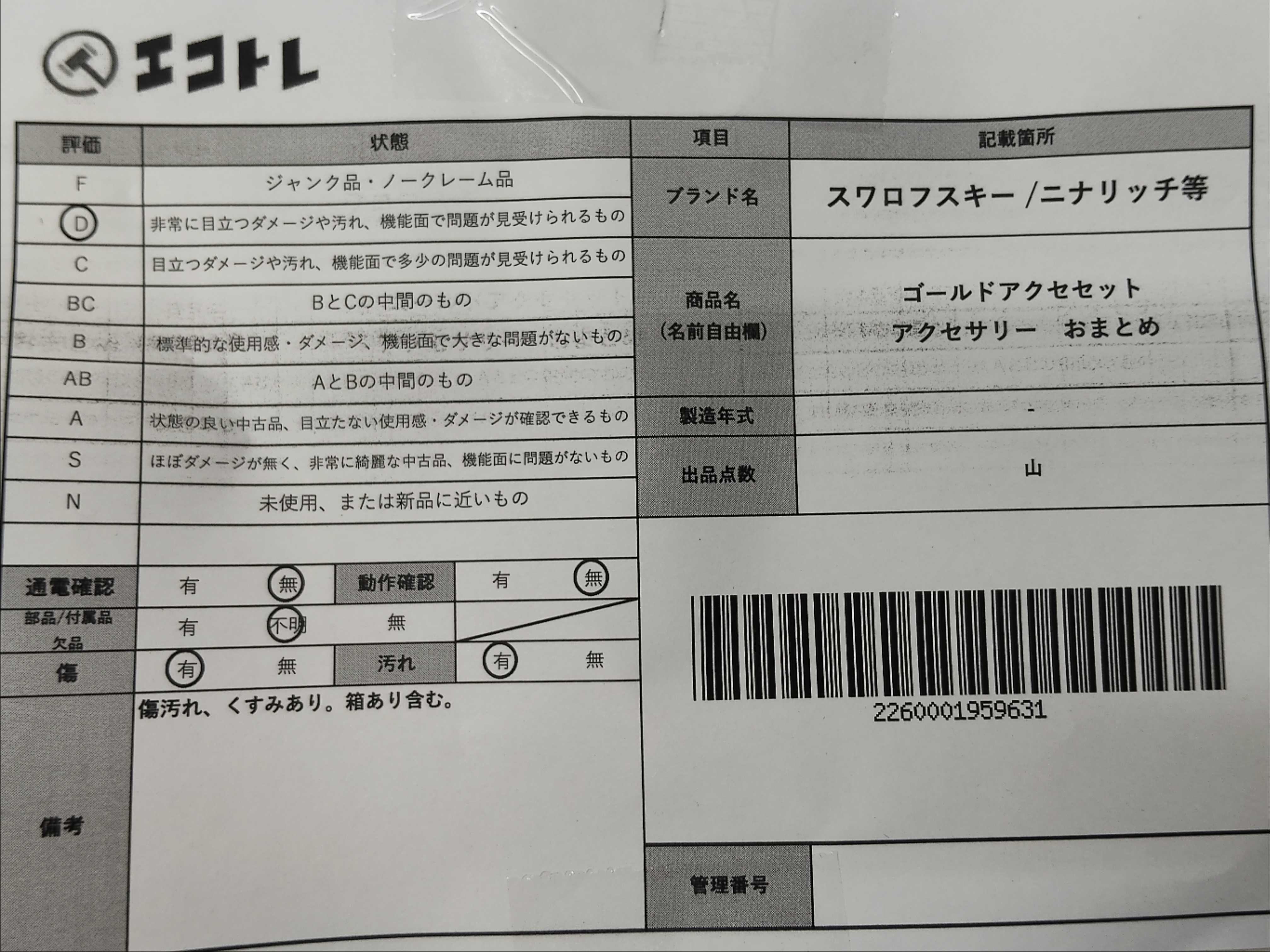 商品内容によって、JITBOXなどでの発送となる可能性がございます事ご理解下さい。年式などの商品情報詳細は写真にてご確認願います。※ご入札の際はご利用規約をよくお読みになってからのご参加お願いします。","タイプライン": "", "カテゴリ": "アクセサリー", "形状コード": "アクセサリーまとめ", "付属品コード": "", "シリアル・シール・型番": ""