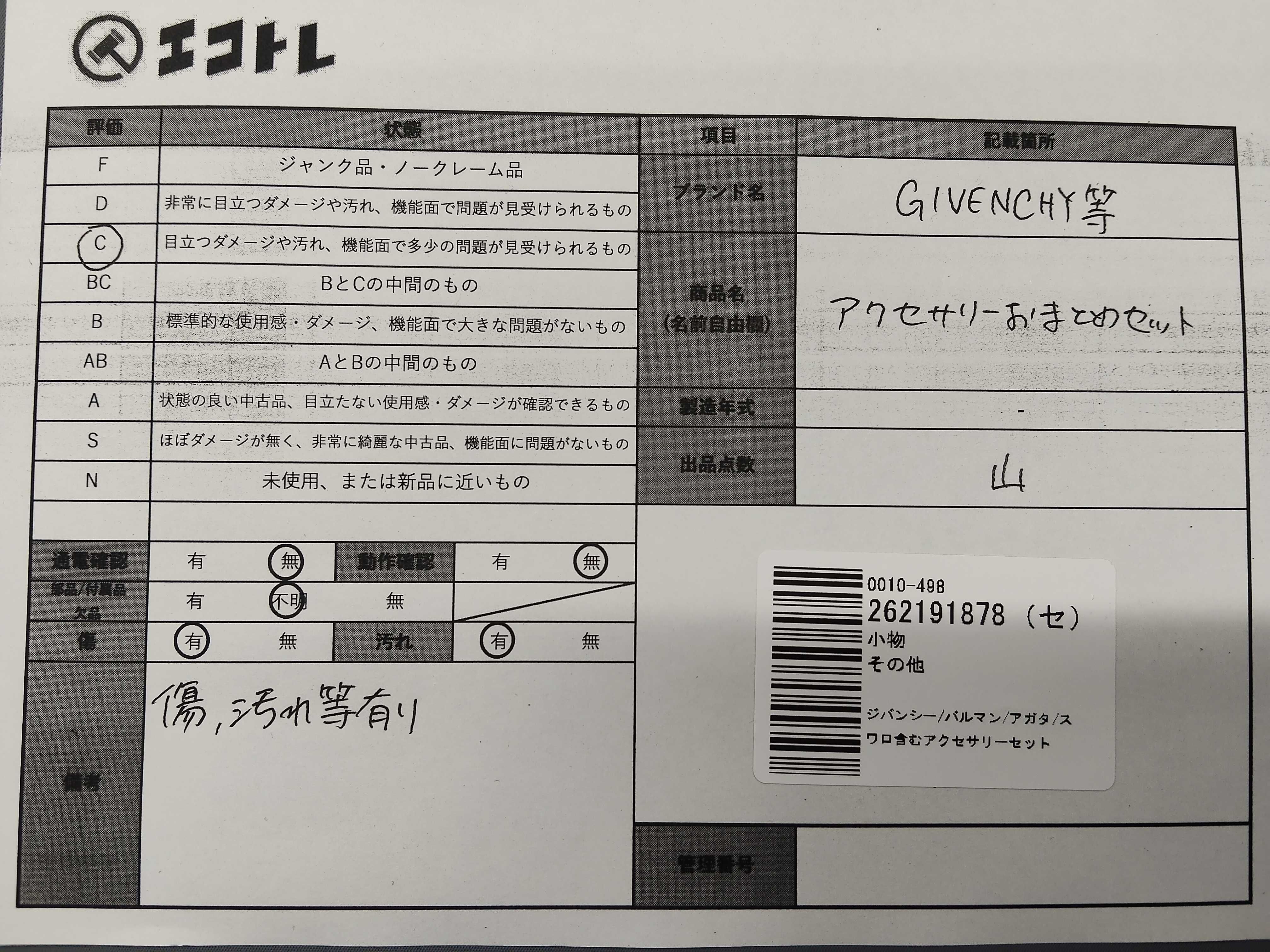 商品内容によって、JITBOXなどでの発送となる可能性がございます事ご理解下さい。年式などの商品情報詳細は写真にてご確認願います。※ご入札の際はご利用規約をよくお読みになってからのご参加お願いします。","タイプライン": "", "カテゴリ": "アクセサリー", "形状コード": "アクセサリーまとめ", "付属品コード": "", "シリアル・シール・型番": ""