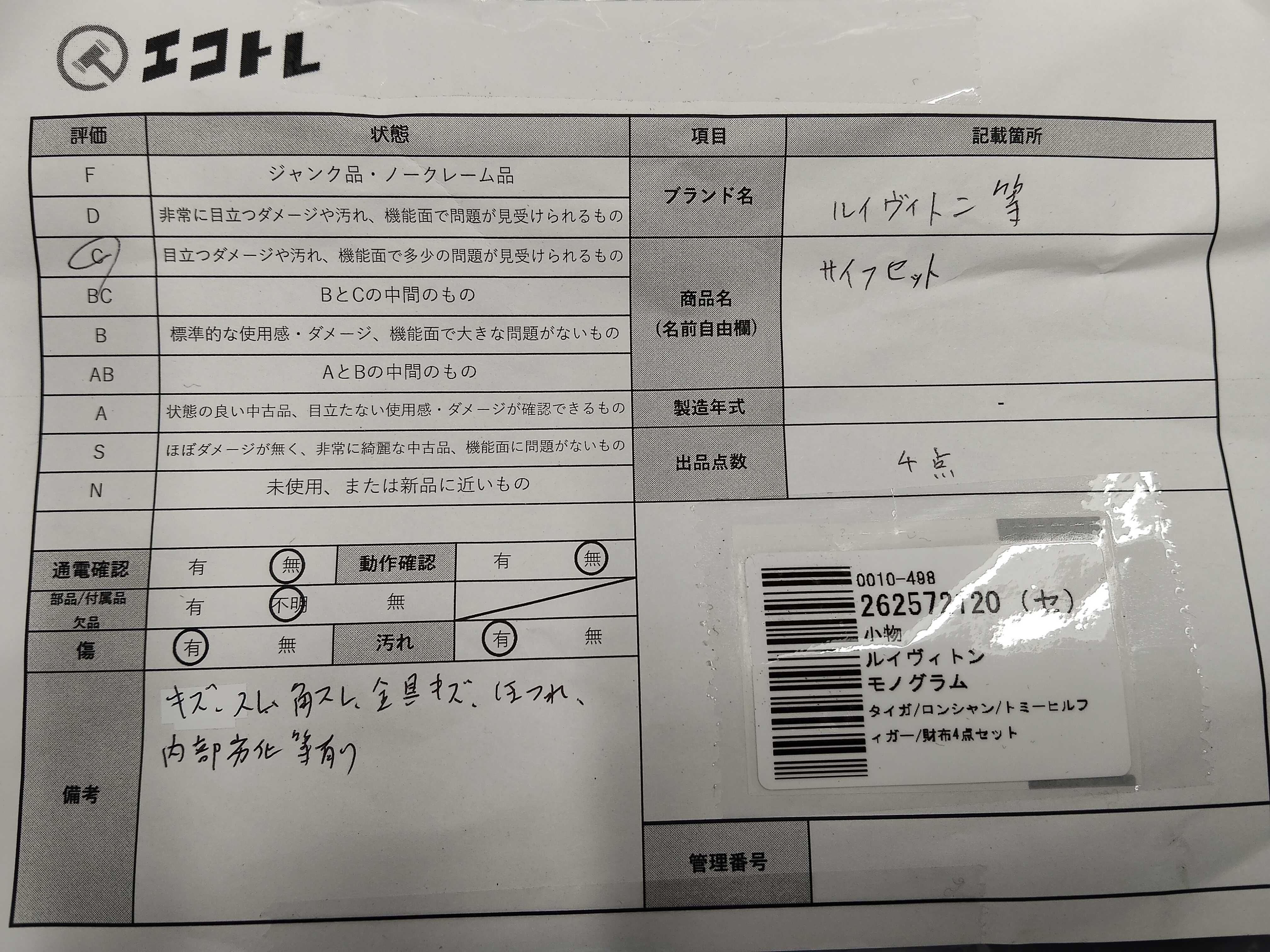 商品内容によって、JITBOXなどでの発送となる可能性がございます事ご理解下さい。年式などの商品情報詳細は写真にてご確認願います。※ご入札の際はご利用規約をよくお読みになってからのご参加お願いします。","タイプライン": "モノグラム", "カテゴリ": "小物", "形状コード": "財布", "付属品コード": "", "シリアル・シール・型番": ""