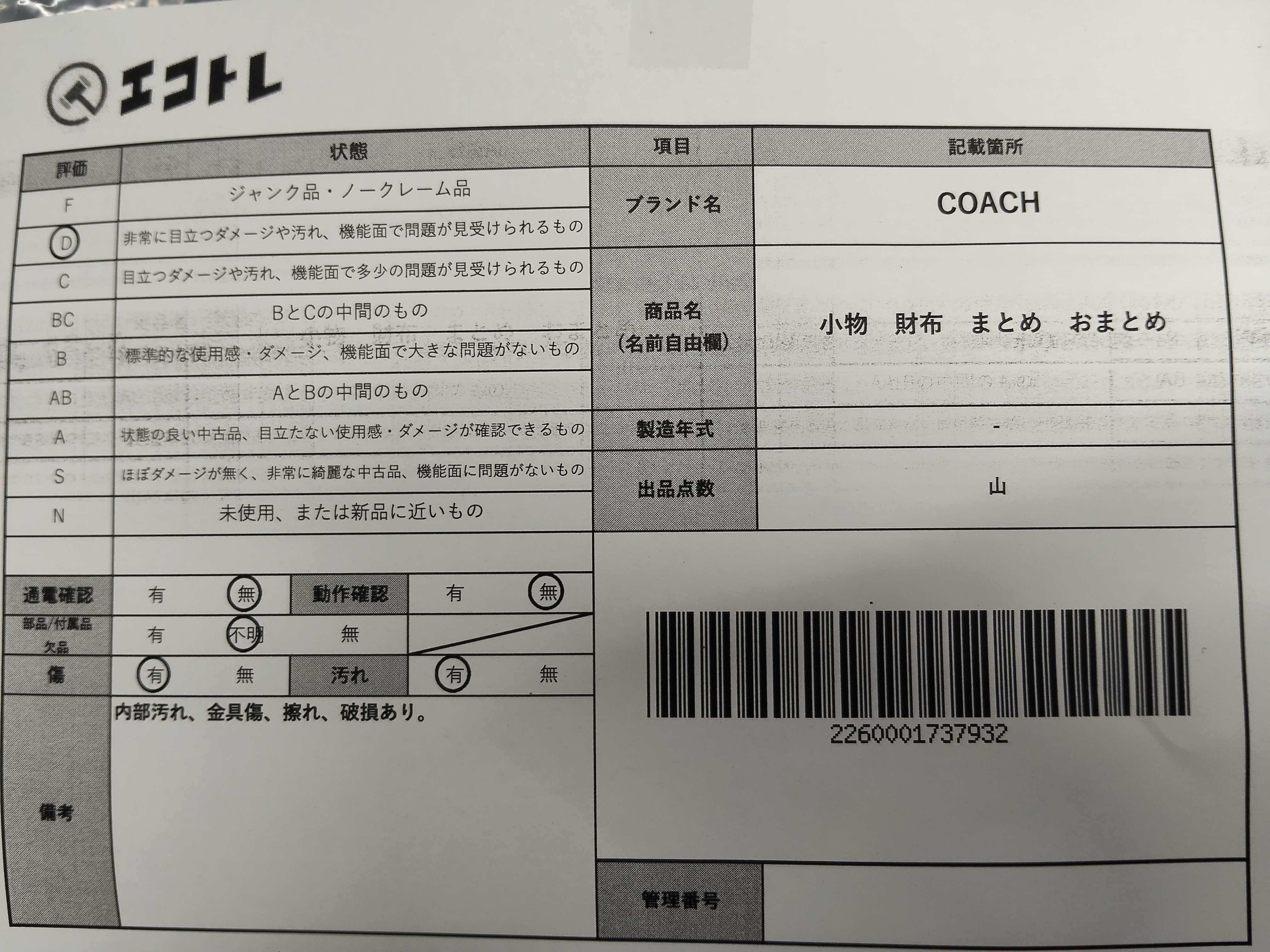 商品内容によって、JITBOXなどでの発送となる可能性がございます事ご理解下さい。年式などの商品情報詳細は写真にてご確認願います。※ご入札の際はご利用規約をよくお読みになってからのご参加お願いします。","タイプライン": "", "カテゴリ": "小物", "形状コード": "財布", "付属品コード": "", "シリアル・シール・型番": ""