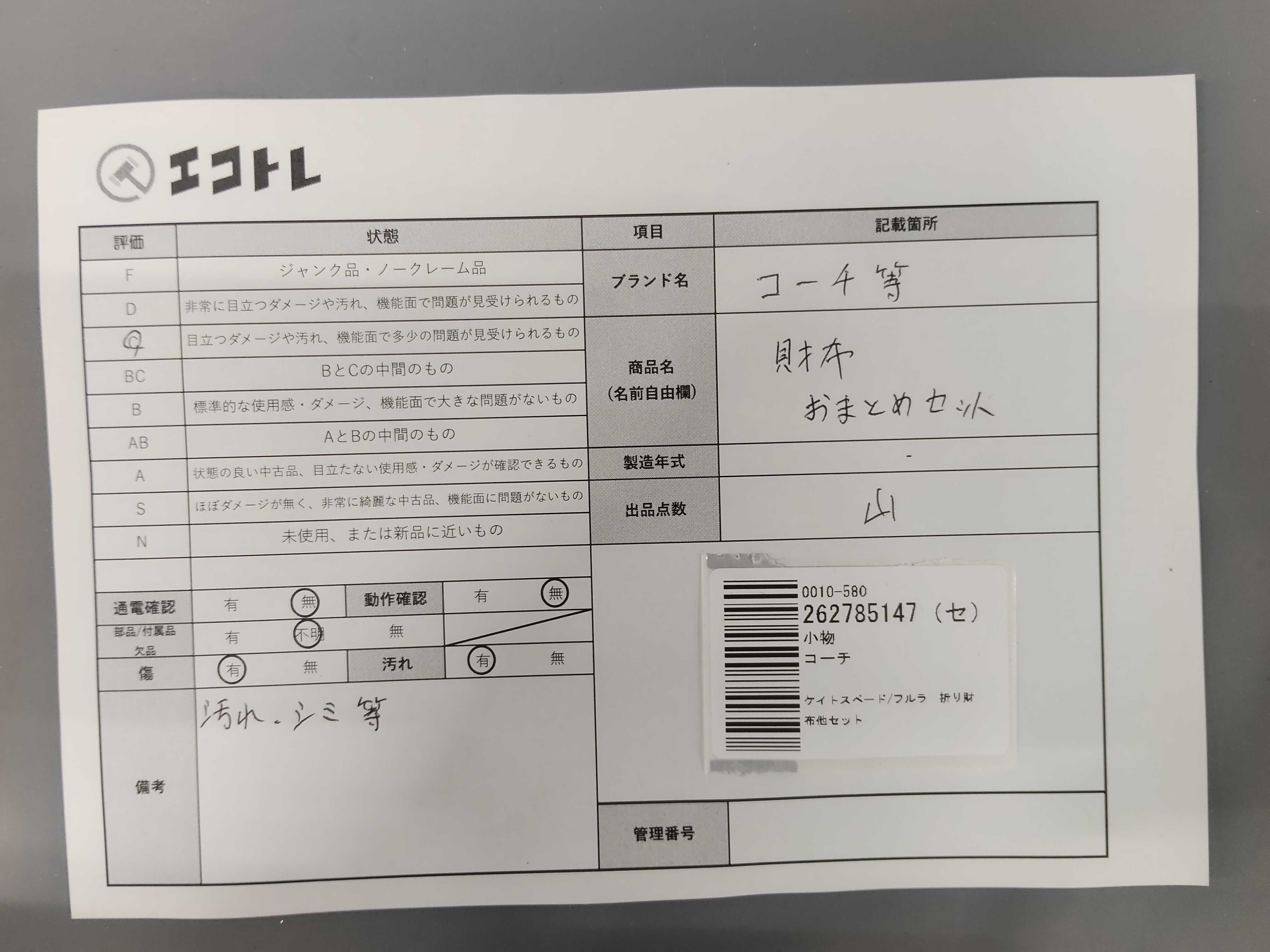 商品内容によって、JITBOXなどでの発送となる可能性がございます事ご理解下さい。年式などの商品情報詳細は写真にてご確認願います。※ご入札の際はご利用規約をよくお読みになってからのご参加お願いします。","タイプライン": "", "カテゴリ": "小物", "形状コード": "財布", "付属品コード": "", "シリアル・シール・型番": ""
