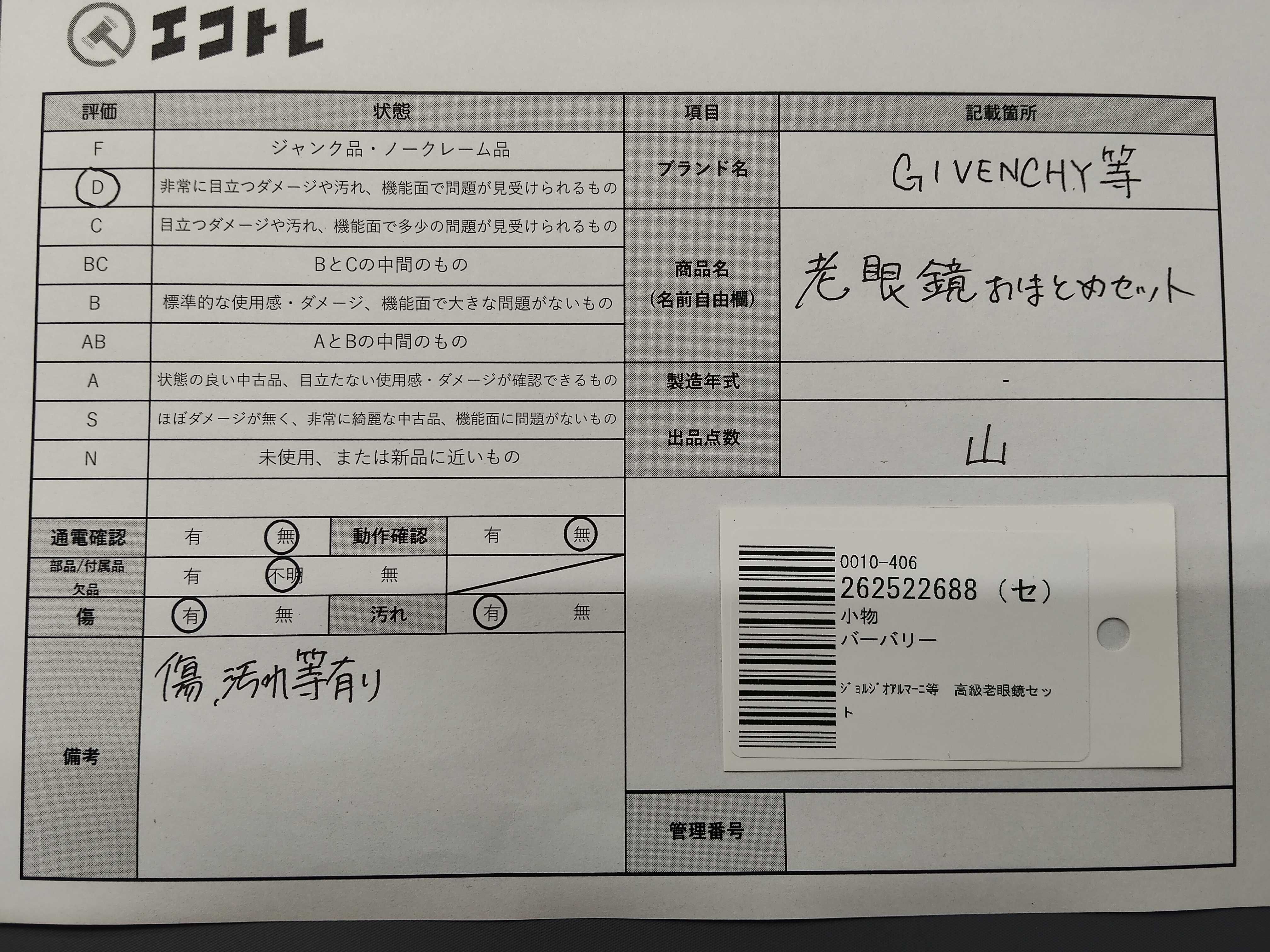 ◆CAN’T SHIPPING TO USA◆商品内容によって、JITBOXなどでの発送となる可能性がございます事ご理解下さい。年式などの商品情報詳細は写真にてご確認願います。※ご入札の際はご利用規約をよくお読みになってからのご参加お願いします。","タイプライン": "", "カテゴリ": "小物", "形状コード": "サングラス・メガネ", "付属品コード": "", "シリアル・シール・型番": ""