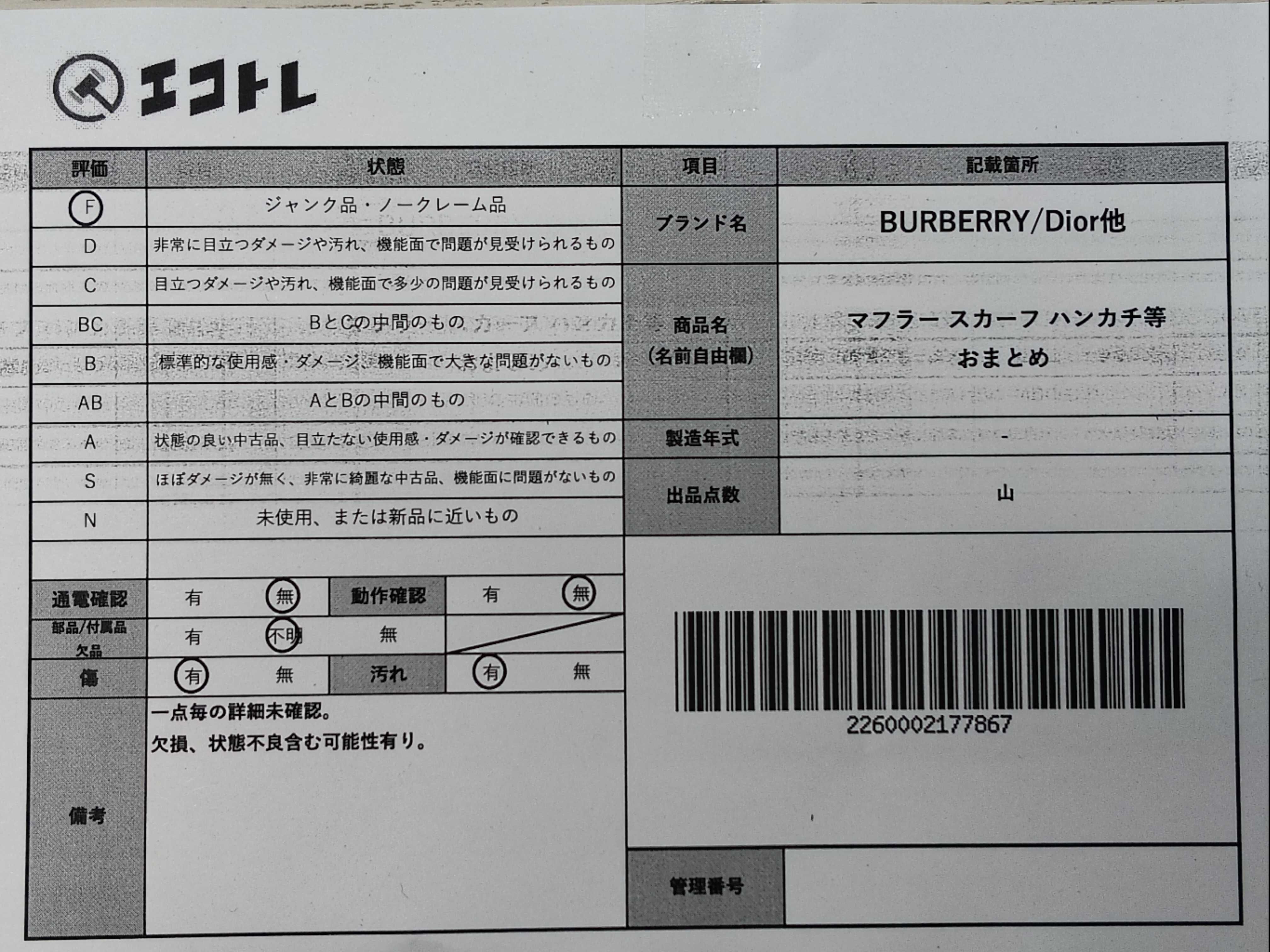 商品内容によって、JITBOXなどでの発送となる可能性がございます事ご理解下さい。年式などの商品情報詳細は写真にてご確認願います。※ご入札の際はご利用規約をよくお読みになってからのご参加お願いします。","タイプライン": "", "カテゴリ": "小物", "形状コード": "その他小物", "付属品コード": "", "シリアル・シール・型番": ""