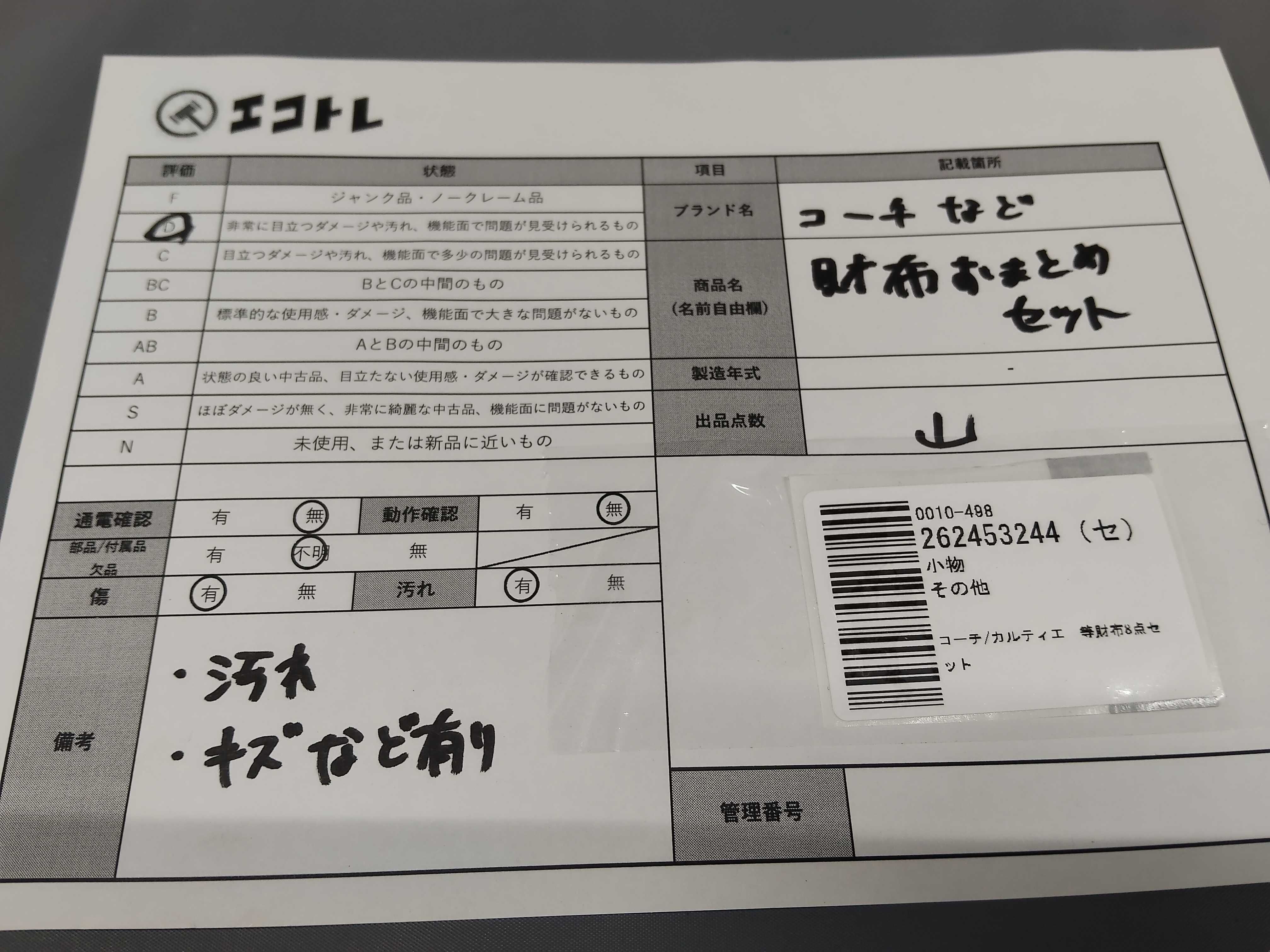 商品内容によって、JITBOXなどでの発送となる可能性がございます事ご理解下さい。年式などの商品情報詳細は写真にてご確認願います。※ご入札の際はご利用規約をよくお読みになってからのご参加お願いします。","タイプライン": "", "カテゴリ": "小物", "形状コード": "財布", "付属品コード": "", "シリアル・シール・型番": ""