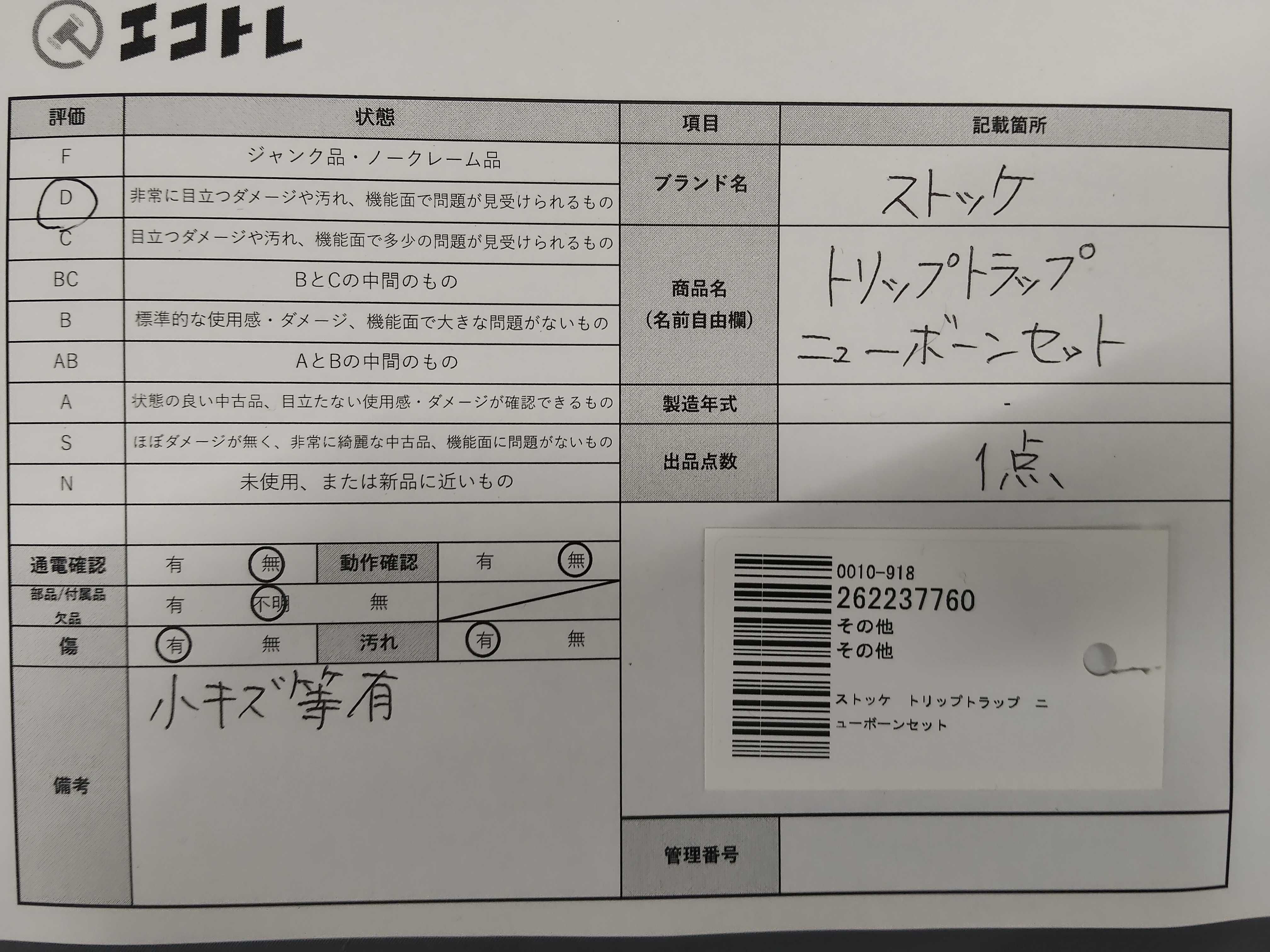 商品内容によって、JITBOXなどでの発送となる可能性がございます事ご理解下さい。年式などの商品情報詳細は写真にてご確認願います。※ご入札の際はご利用規約をよくお読みになってからのご参加お願いします。","タイプライン": "", "カテゴリ": "小物", "形状コード": "その他小物", "付属品コード": "", "シリアル・シール・型番": ""